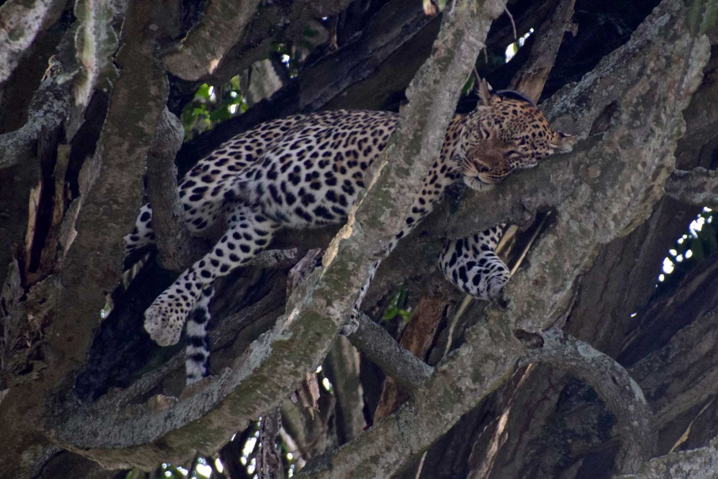 Wir machen eine Safari im Queen Elizabeth NP und sehen dabei Büffel, Elefanten, Warzenschweine, Hippos, Uganda Cobs... und zum Schluss noch einen Leoparden auf einem Baum...