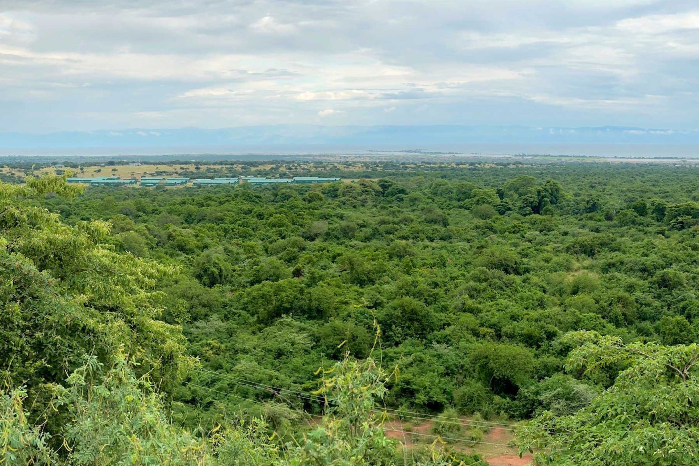 Danach fahren wir auf der anderen Seite der Hauptstraße durch den Park zur Mweya-Halbinsel mit einer Luxus Lodge auf dem Berg mit einer Wahnsinns Aussicht...