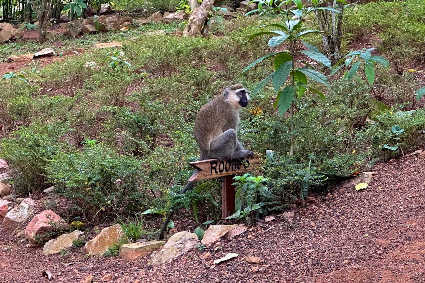 Frühstück um 07.00 Uhr. Unser Guide für die Rundreise, Meddy, kommt dazu. Die Grünmeerkatzen spielen im Garten.
