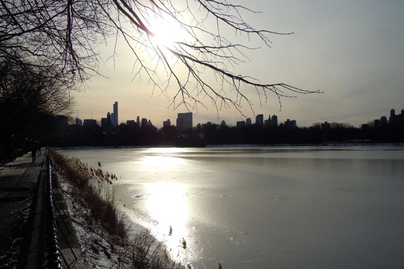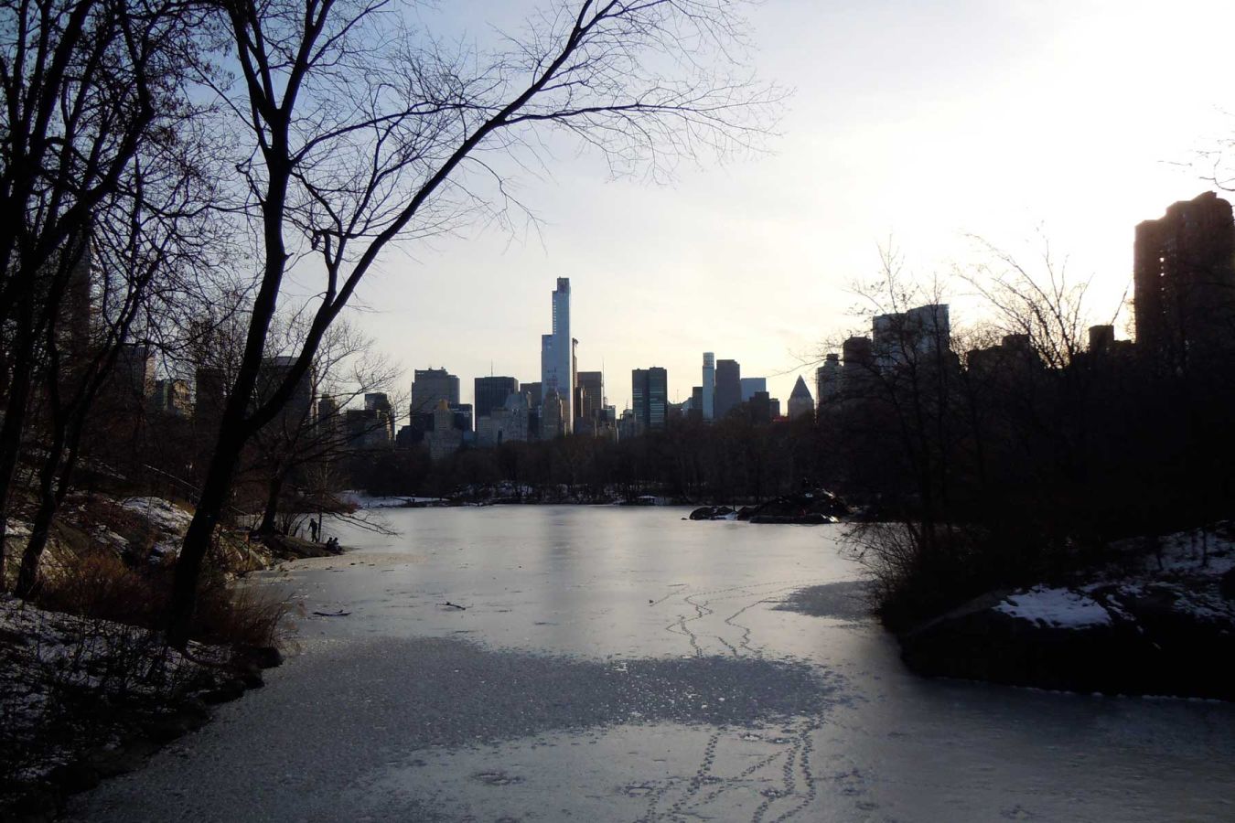 Beim Guggenheim Museum überqueren wir die 5th Avenue und stehen vor dem riesigen Reservoir, einem See inmitten des Central Parks. Wir gehen durch den verschneiten Central Park (Reservoir, The Great Lawn, Belvedere Castle, The Lake, Bethesda, Wollman Rink) bis zum ehemaligen Hotel Plaza am Südost-Ende des Parks (5th Avenue/59th Street).