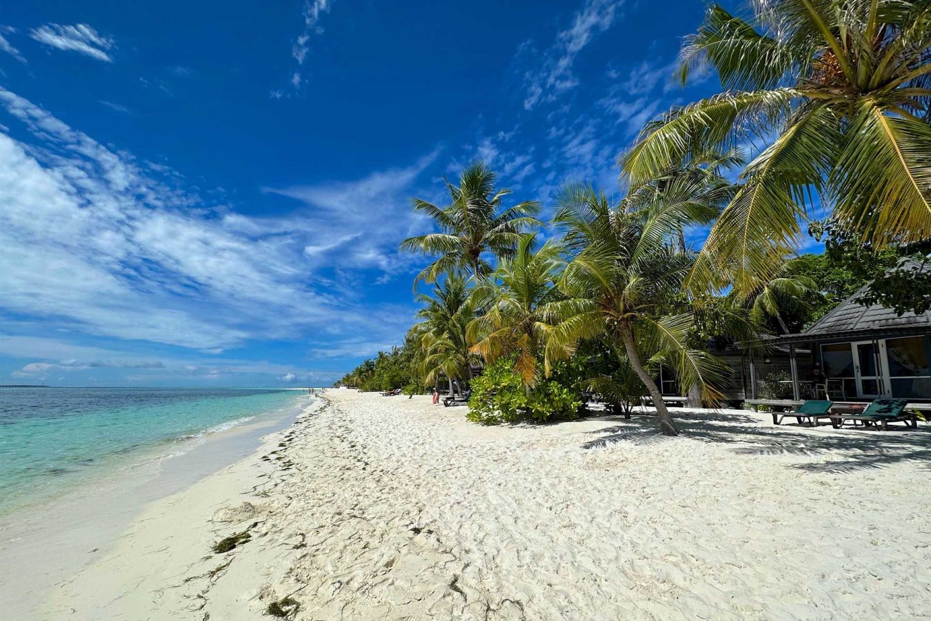 Jede Villa hat einen Tisch und zwei Stühke auf der Terrasse, davor unter Palmen zwei eigene Liegen und nur einige Meter weiter das blaue bzw. hellgrüne Meer des Indischen Ozeans...