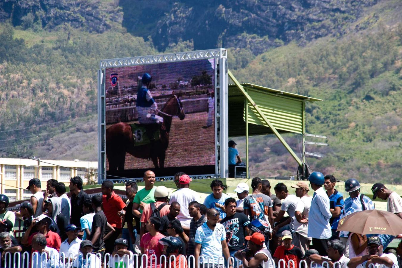 Wir gehen auf der Tribüne ganz nach oben und haben einen hervorragenden Blick auf den Sattelplatz auf der einen Seite und die Rennbahn auf der anderen Seite.