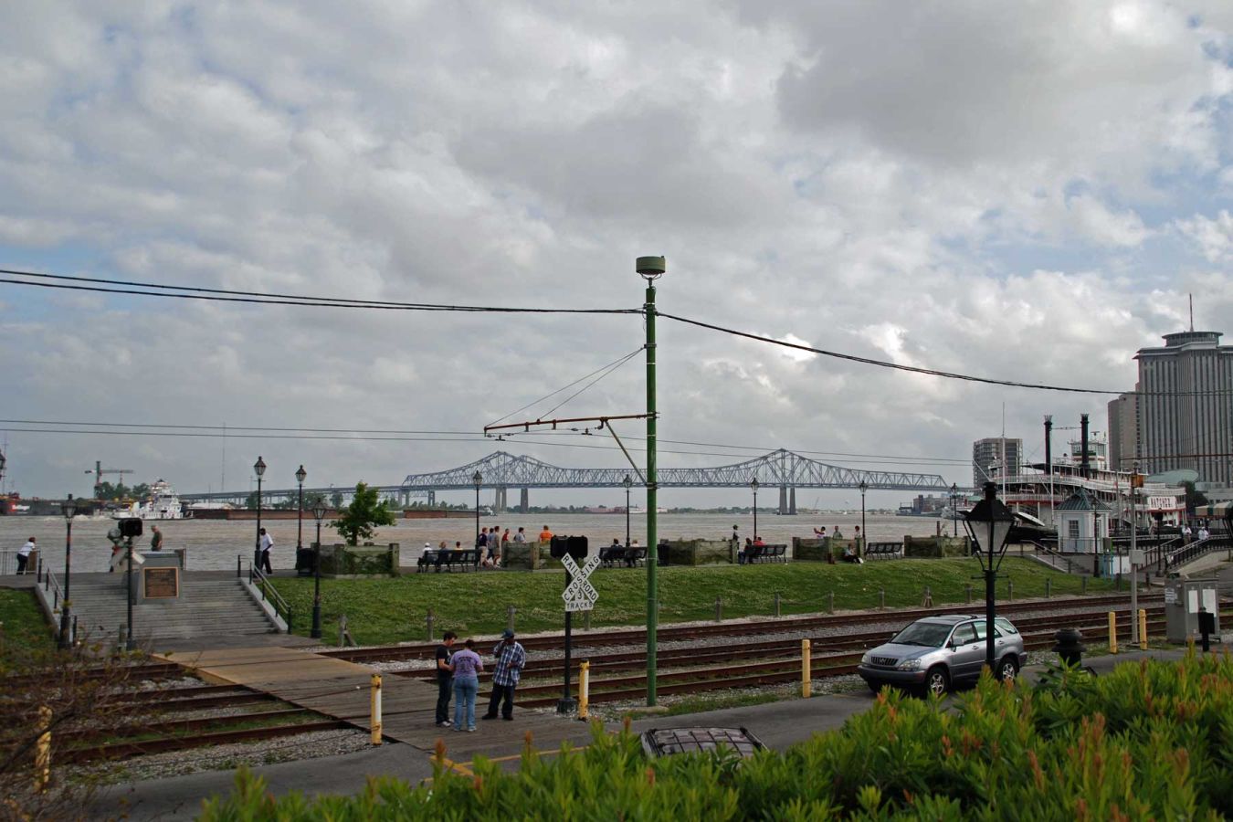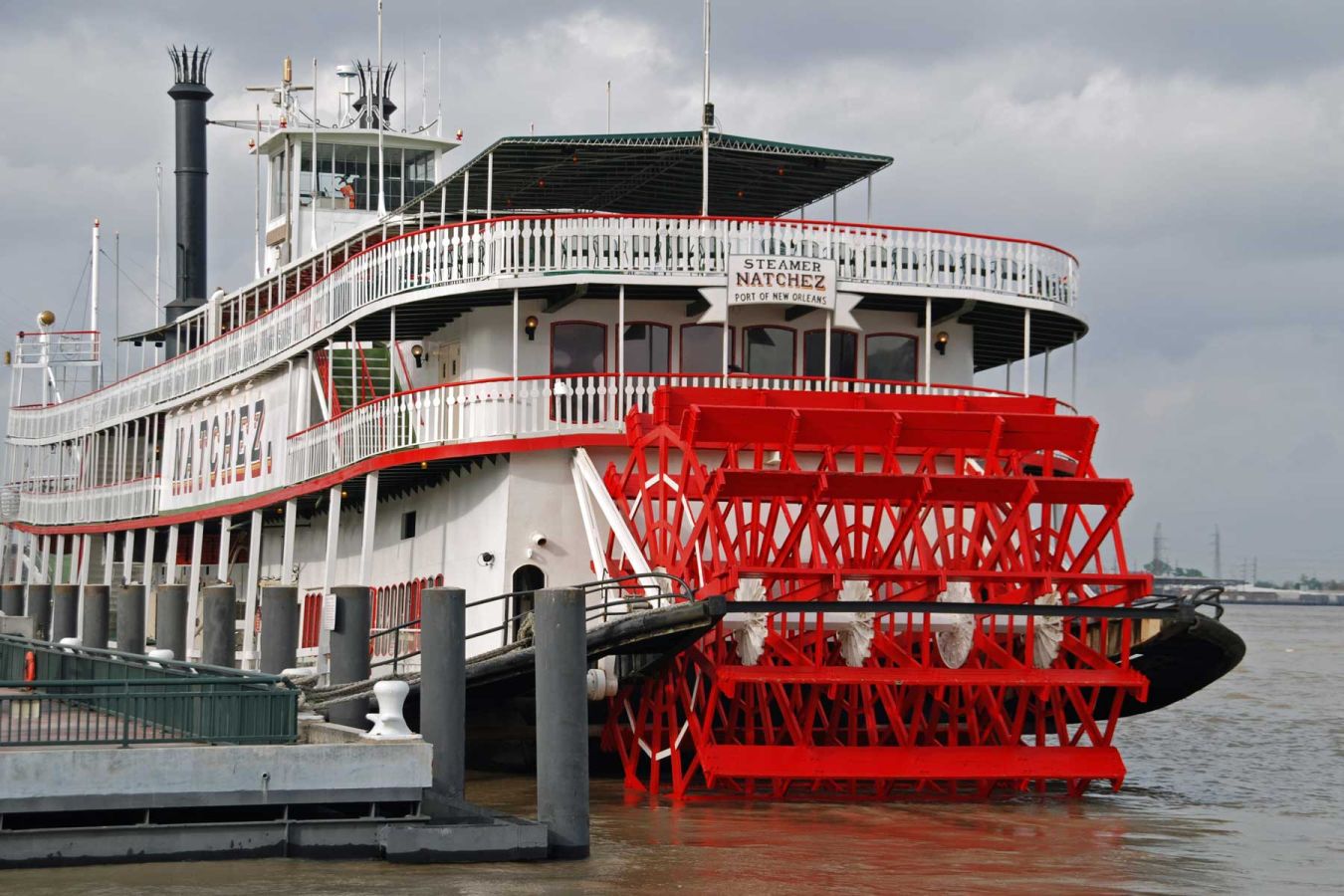 Wie spazieren über Dauphine Street und St. Peter Street zum Jackson Square. Dort geht’s über einige Stufen hinauf (!!) zum Mississippi River. Der beeindruckend breite Fluss fließt träge dahin und am Ufer steht der berühmte Raddampfer „Natchez“.