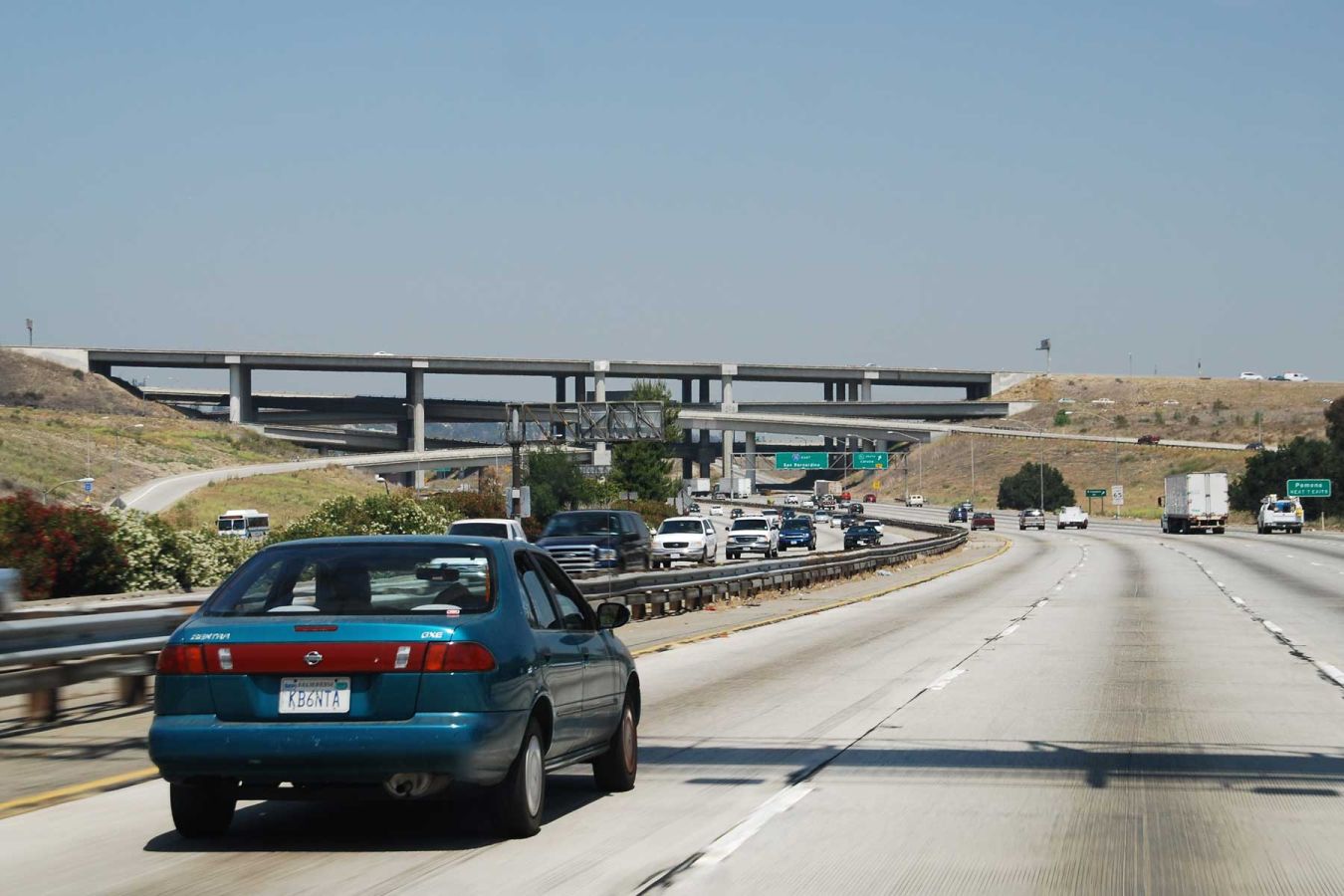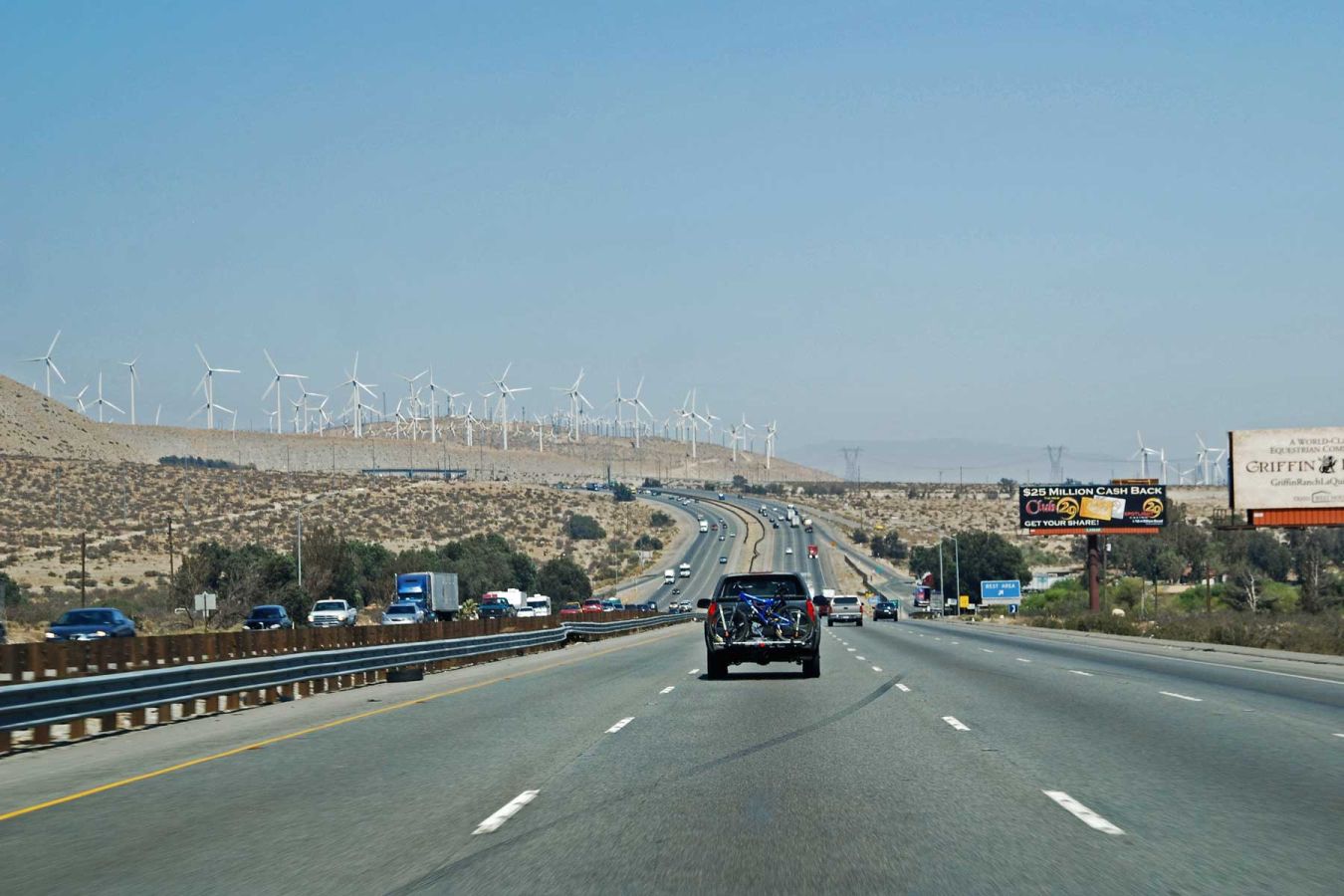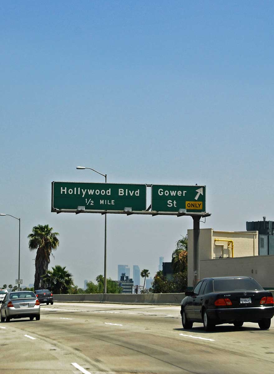 Die Durchfahrt durch L.A., nahe an Downtown vorbei, erfolgt auf einer 5-6-spurigen Autobahn. Man sieht viele Ausfahrtsschilder (Beverly Hills, Hollywood Blvd, …), die man vom Fernsehen kennt. Wir fahren durch unzählige Vororte im Großraum von Los Angeles bis wir endlich in die Wüste kommen.