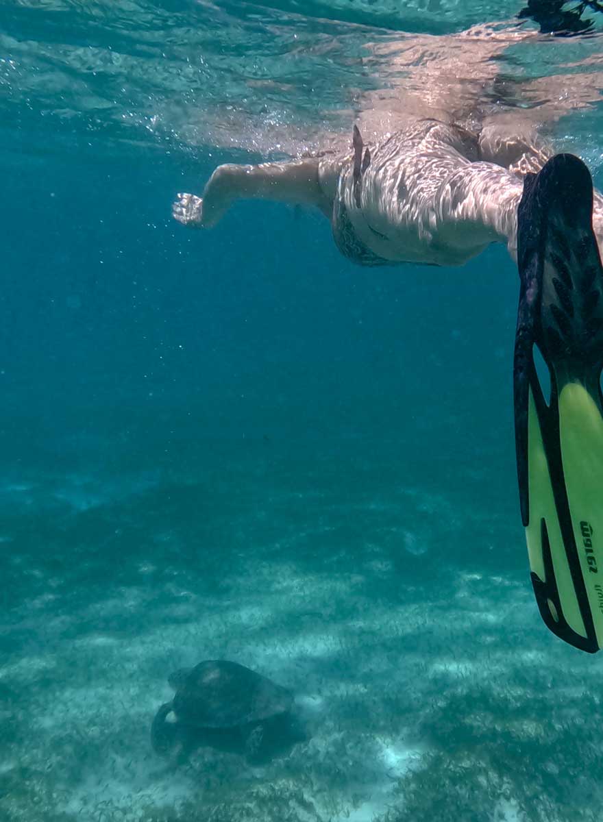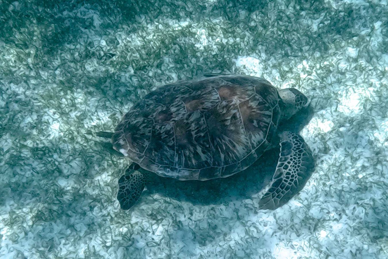 Beginne das Schnorchelabenteuer direkt am Main Beach vor dem Hauptrestaurant. Die meisten Wasserschildkröten, kleinen Haie und Fische findet man bereits einige Meter im Wasser...