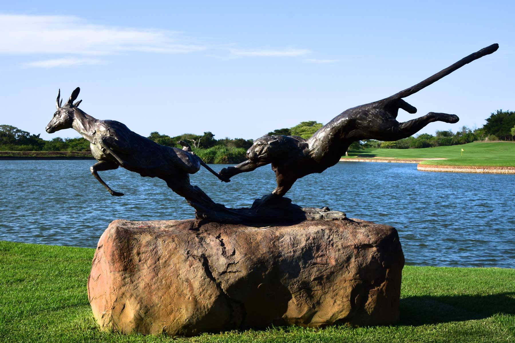 oben: Leopard-Firguren; links: 12.Loch; rechts: Figur; unten: 9.Loch