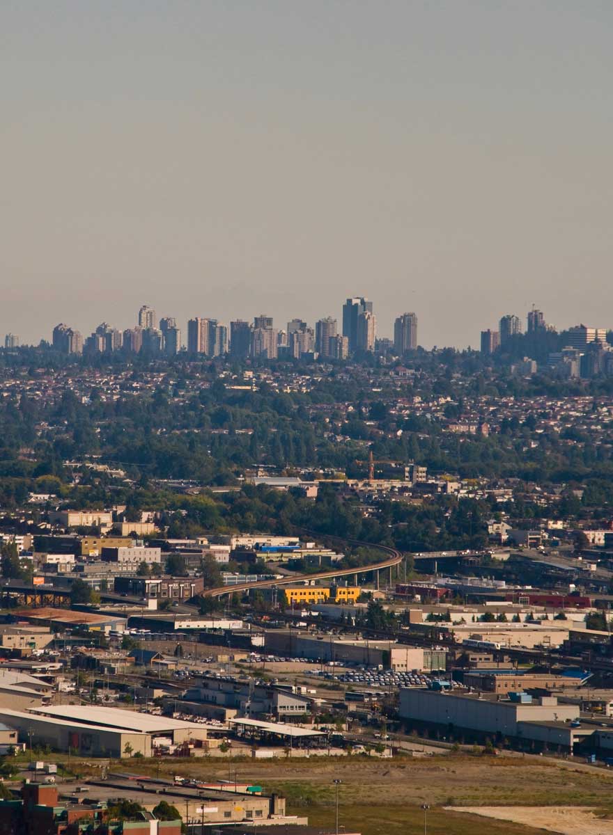 oben: Osten; links: BC Place; rechts: Vororte; unten: Stanley Park