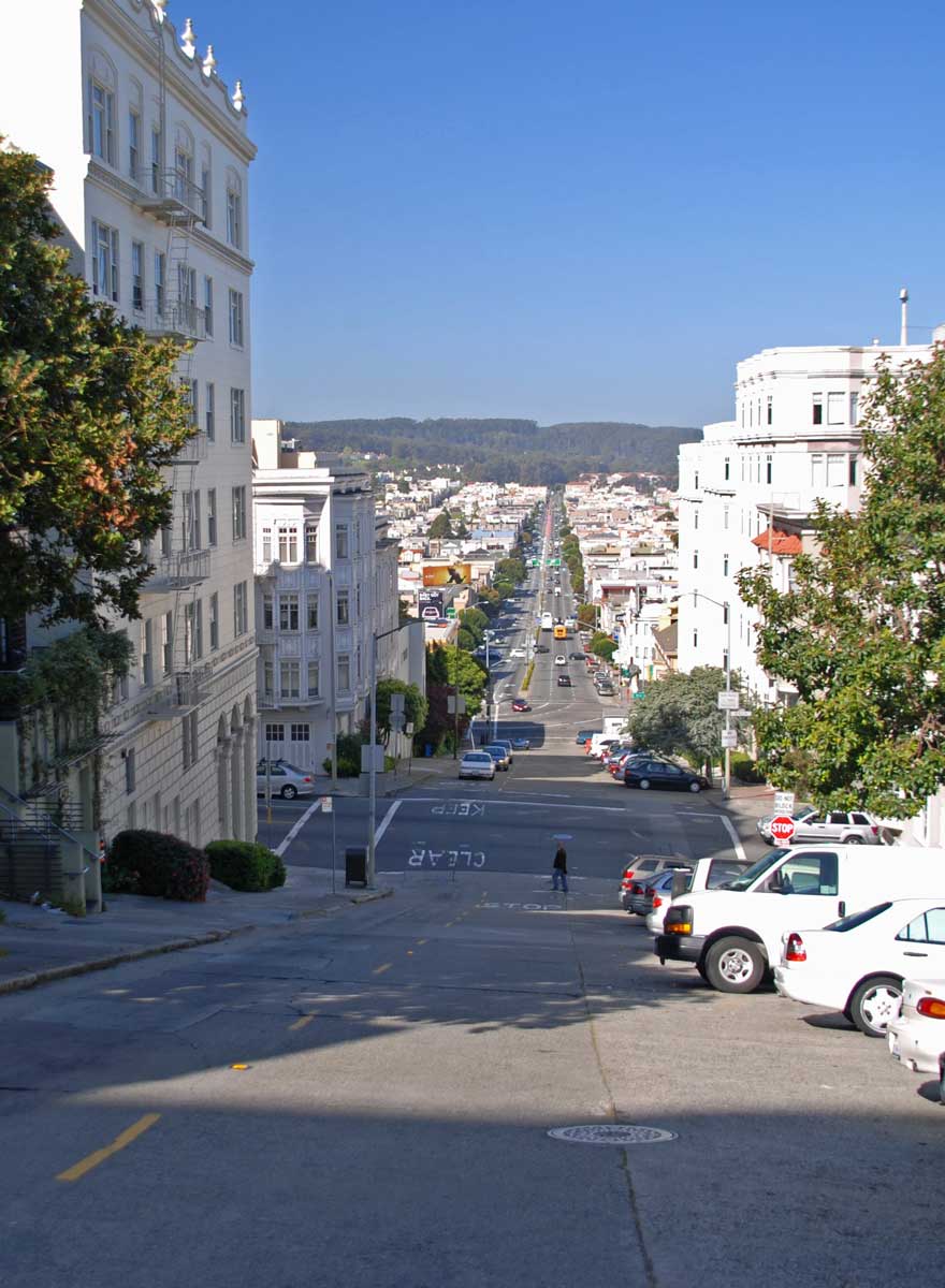 oben: Russian Hill; links: Richtung Westen; rechts: Richtung Osten; unten: parkende Autos