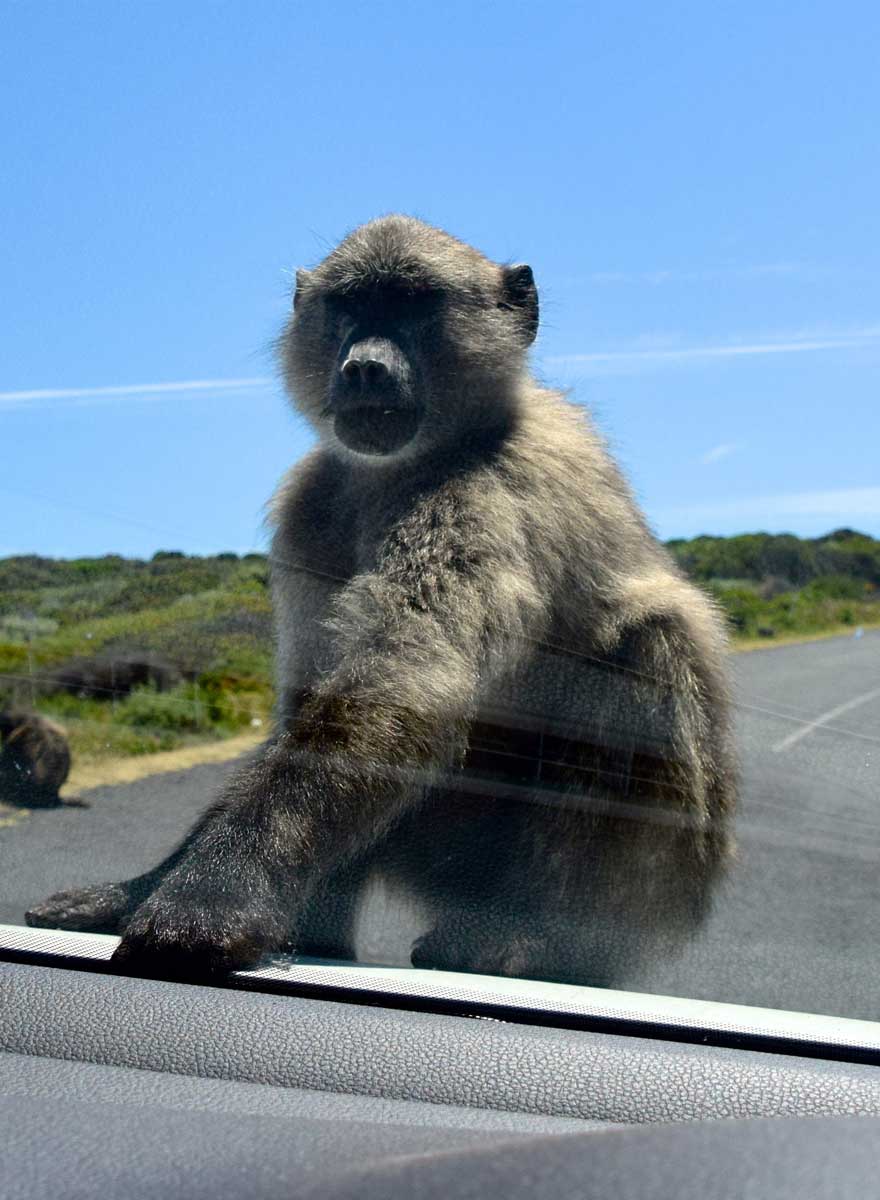 oben: Westküste; links: Baboon auf dem Auto; rechts: Funicular; unten: Schild