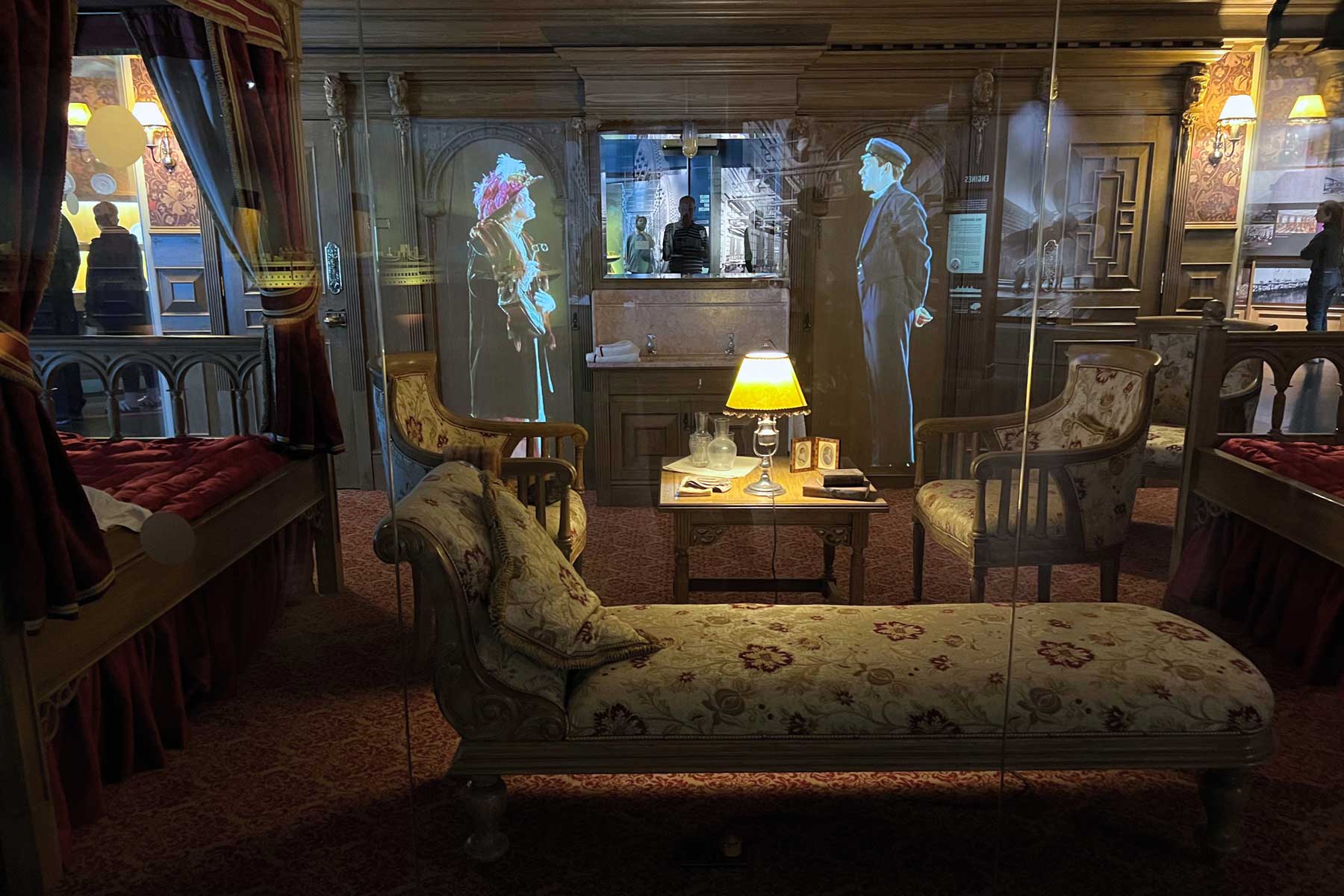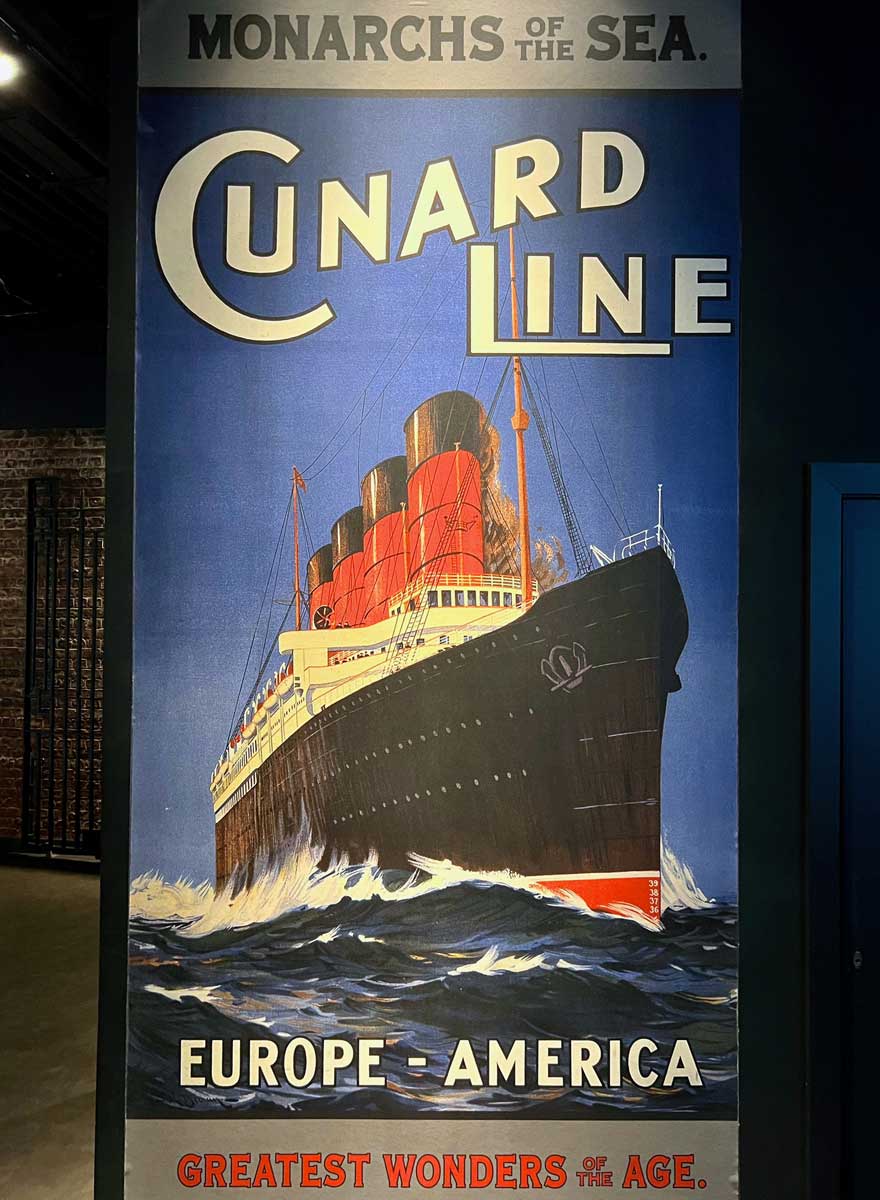 oben: Schiffsnachbau; links: Jungfrau vor Museum; rechts: Plakat; unten: Kabine 1.Klasse