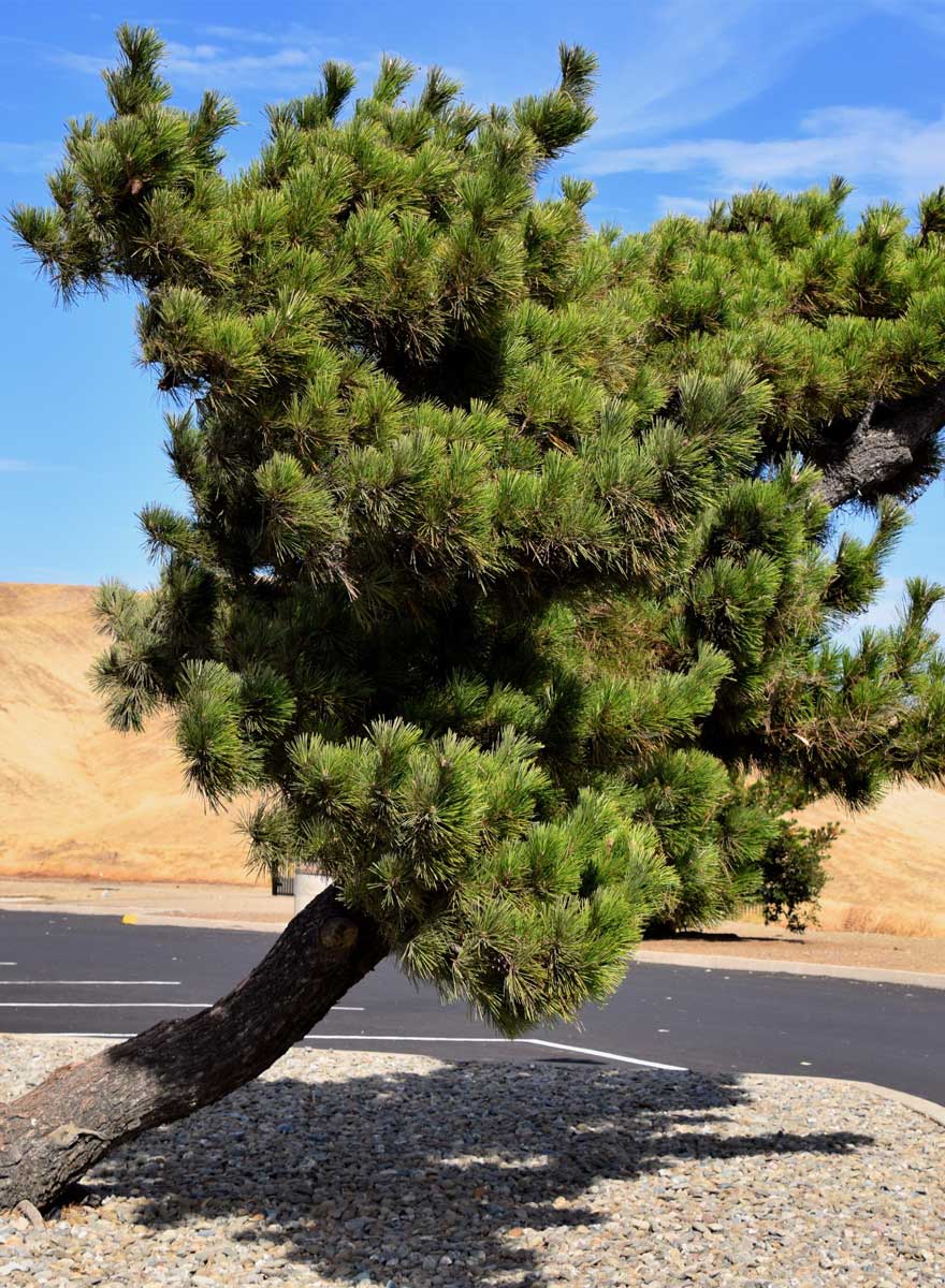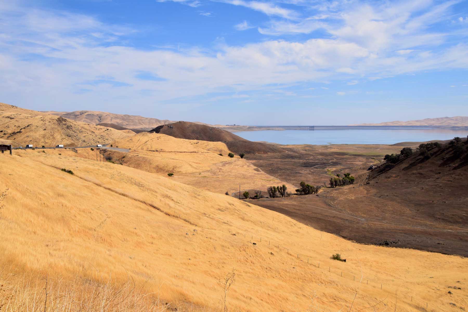 oben: Highway 152; links: Parkplatz; rechts: Landschaft; unten: Stausee