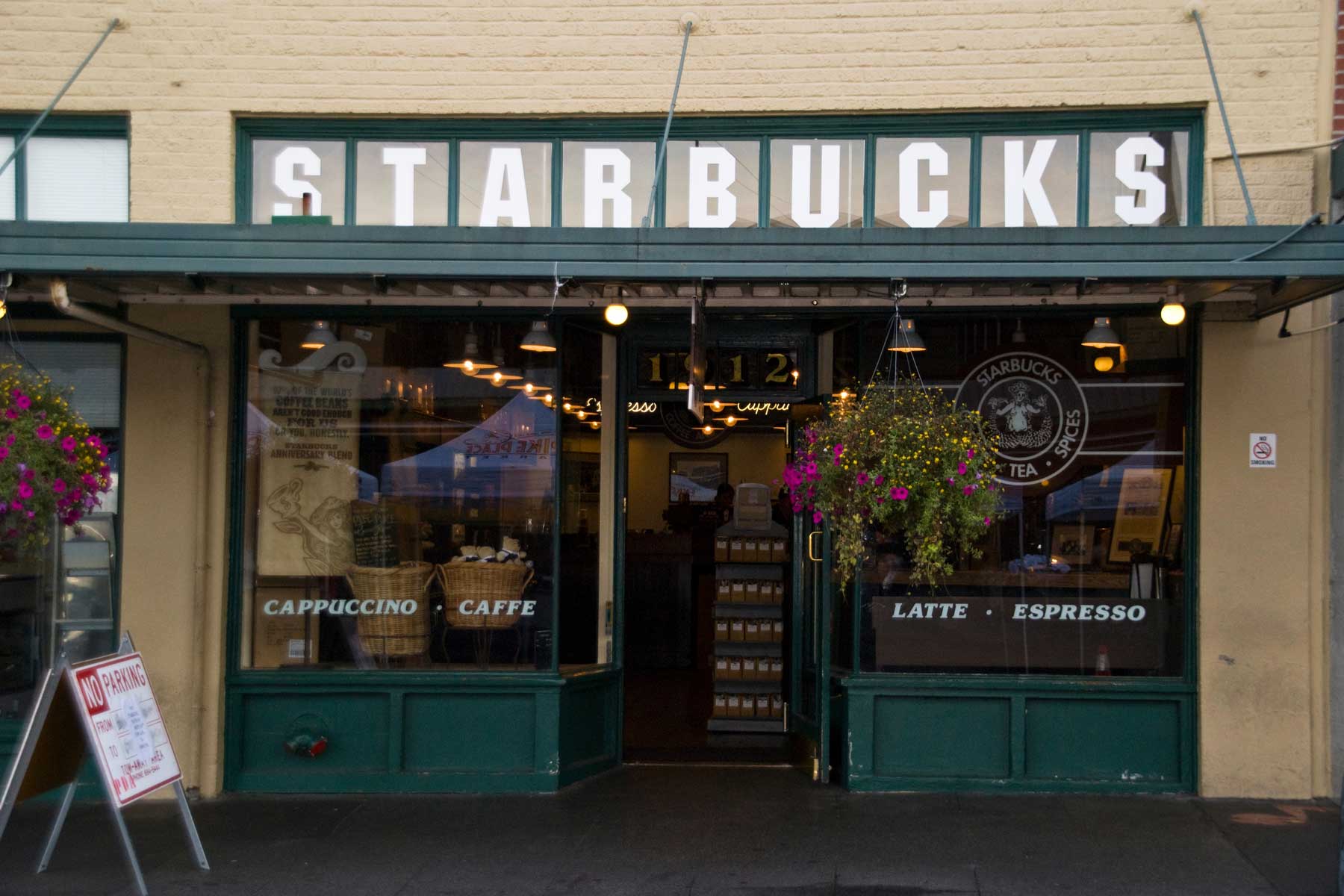 Das erste Starbucks Cafe eröffnete im Jahr 1971 und war ursprünglich in der Western Avenue beheimatet. Im Jahr 1977 wurde es um einen Block verlegt und bewirtet seitdem am Pike Place seine Kunden. Hier hat die Erfolgsgeschichte um den Kaffee in Pappbechern ihren Ursprung. Am Schaufenster prangt immer noch das ursprüngliche Logo mit einer barbusigen Sirene und dem Text „Coffee – Tea – Spices“.Benannt wurde das Unternehmen nach dem Steuermann Starbuck aus dem Roman „Moby Dick“. Mit diesem Namen sollte an die Seefahrerromantik der ersten Kaffeehändler erinnert werden.