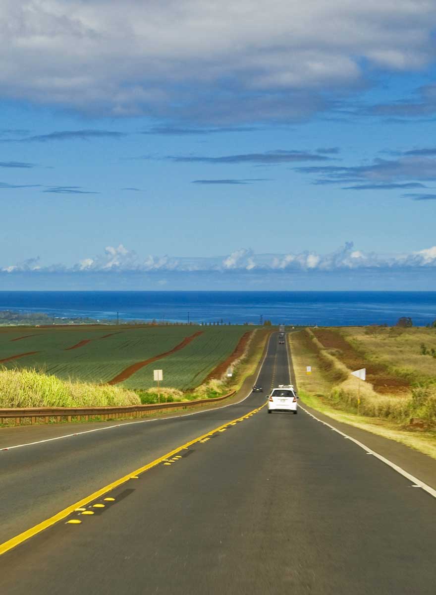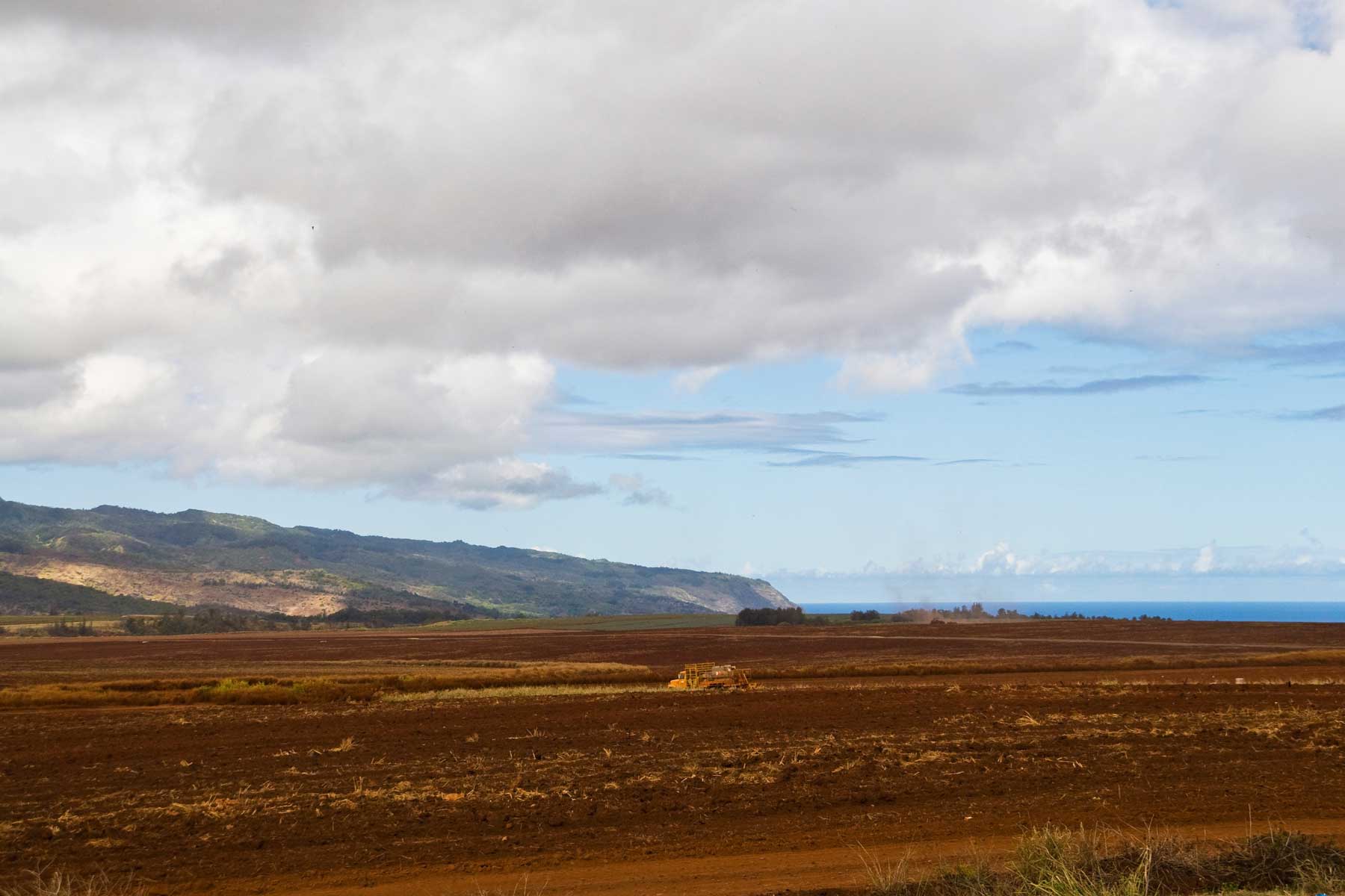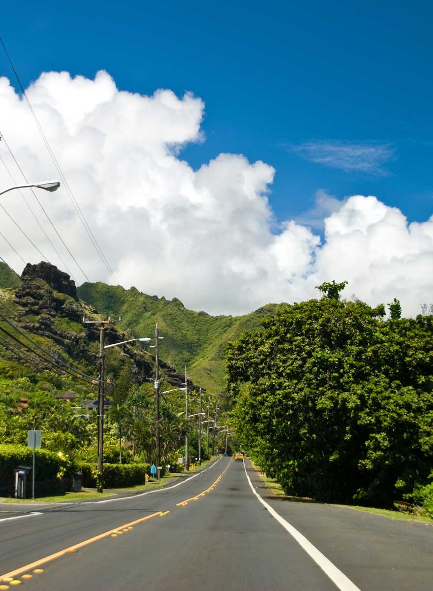 oben: Felder bei Waialua; links: Highway & Meer; rechts: Highway & Berge; unten: Kahana Bay