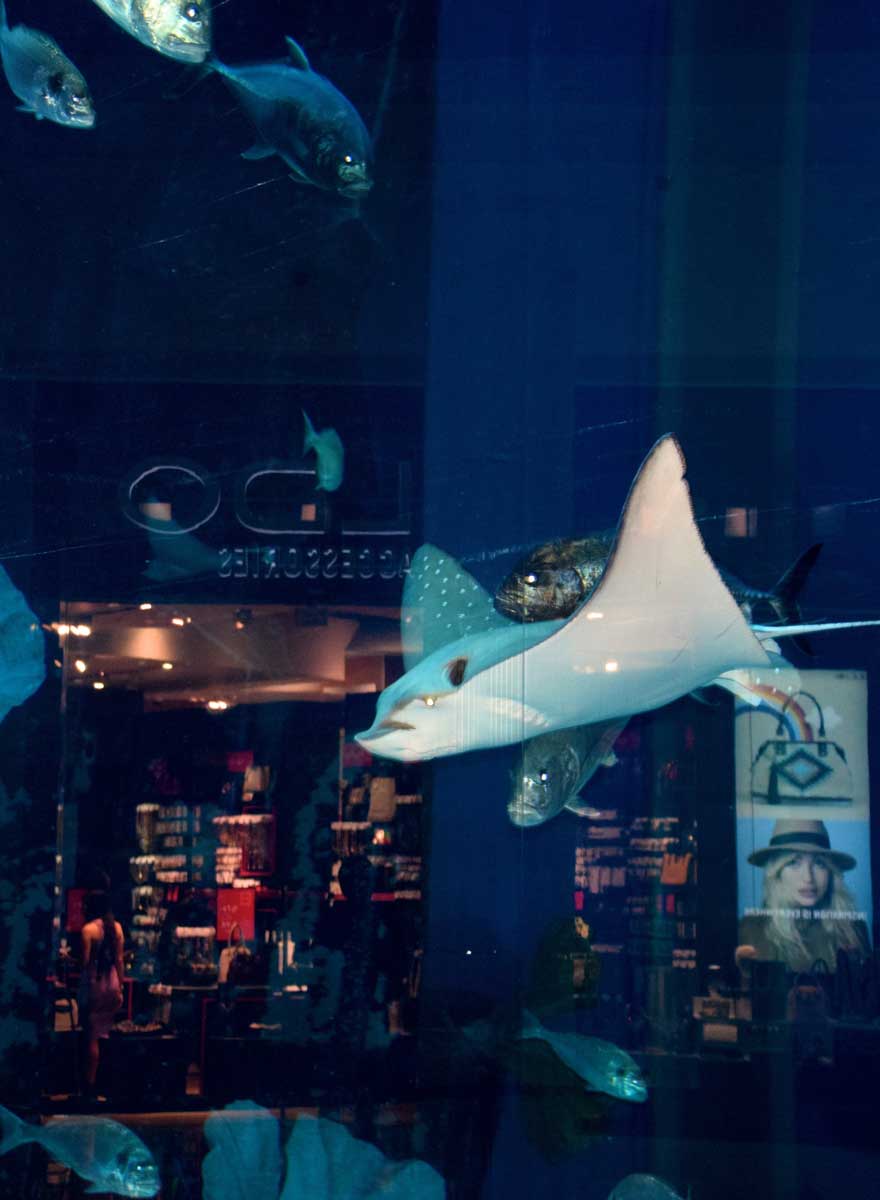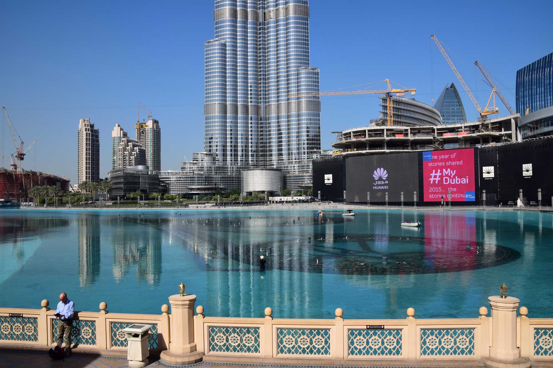 oben: Shops; links: Rochen; rechts: Aquarium; unten: Wasserbecken vor Burj Khalifa