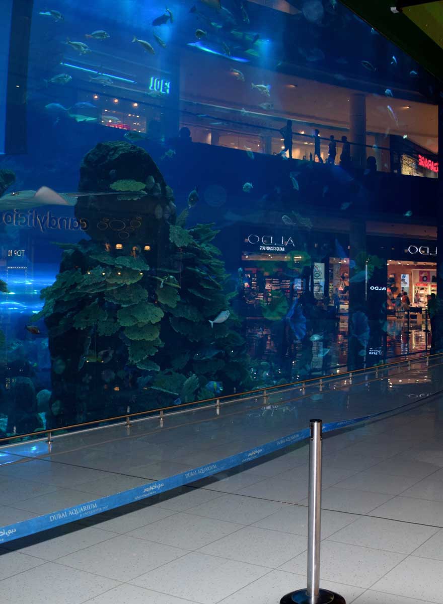 Eine weitere Attraktion der Dubai Mall ist das sich über drei Etagen erstreckende Aquarium. Das größte Becken hat eine Grundfläche von 51 × 20 Meter und ist 11 Meter hoch. In dem aus 75 Zentimeter dicken Acrylglas bestehenden größtem Becken befinden sich in 10.000 Kubikmetern Seewasser, das man dem Persischen Golf entnimmt, 33.000 Seetiere und Fische u. a. Haie mehrerer Arten, Barsche, Rochen und andere Riffbewohner. Krokodile, Riesenkrabben aber auch Robben und Pinguine befinden sich in weiteren kleineren Becken. Durch das untere Becken verläuft ein zwei Meter hoher schmaler Fußgängertunnel, dessen Wände nur 19 Zentimeter dick sind, was der natürlichen Größenwiedergabe der Tiere dient. Da kein natürliches Licht in das Becken dringt, verfügt es über eine Lichtanlage mit Regie für Tag- und Nachtsimulation; ebenso über Fütterungsautomaten und eine wassersparende Wasserumlauf- und Reinigungstechnik, das Wasser wird mit Ozon keimfrei gehalten. Alle eingebauten und echt aussehenden Felsen- und Korallenobjekte sind aus Kunststoff, um die Wasserqualität stets unter Kontrolle zu haben. Die Wassertemperatur wird konstant bei 24 Grad Celsius gehalten.