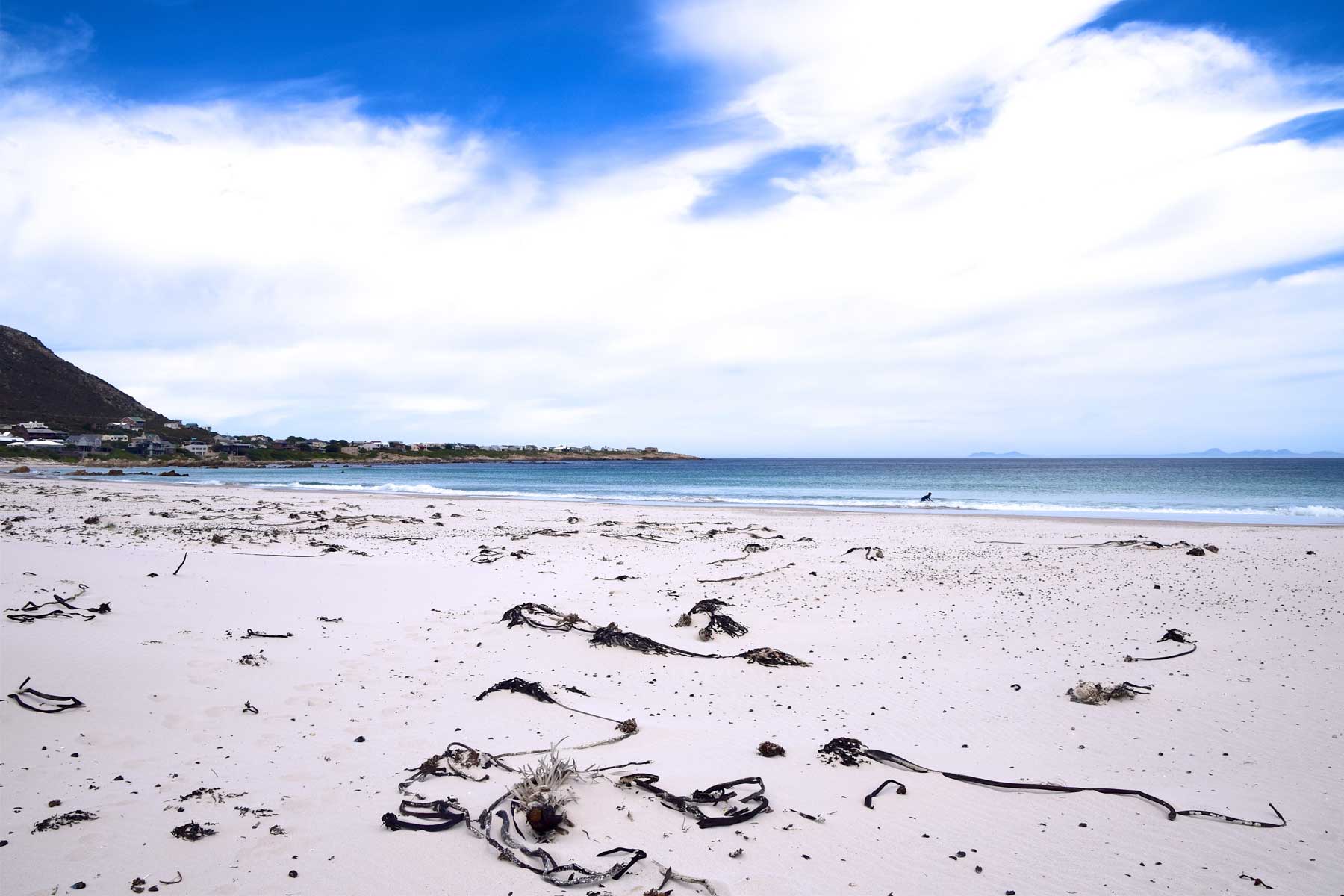 Der Strand in Pringle Bay ist lang und weit mit schneeweissem feinen Sand. An Rückseite des Strandes, in Richtung der Ortschaft, befinden sich Sanddünen und weiter im Hintergrund befindet sich die Bergkette.