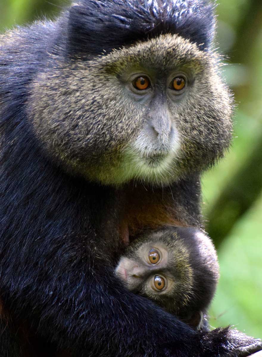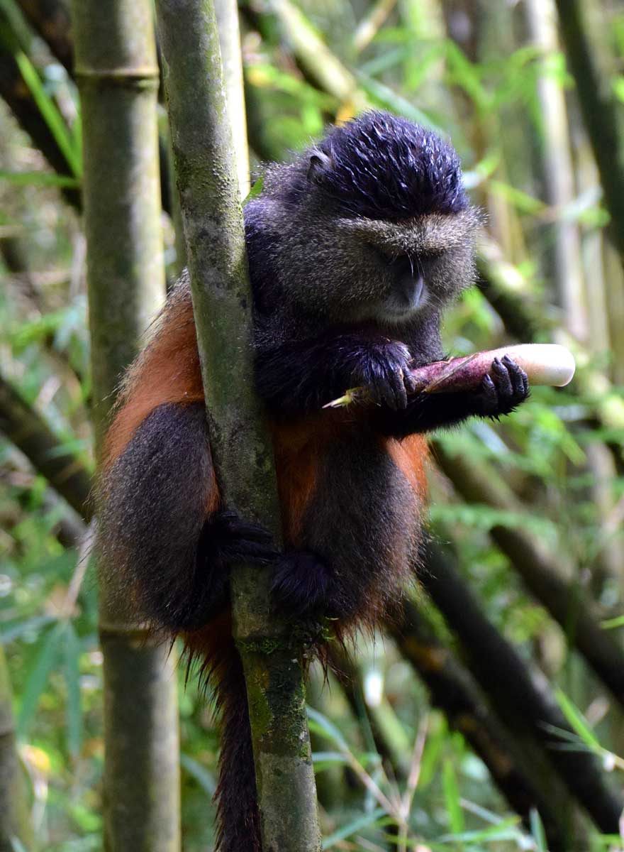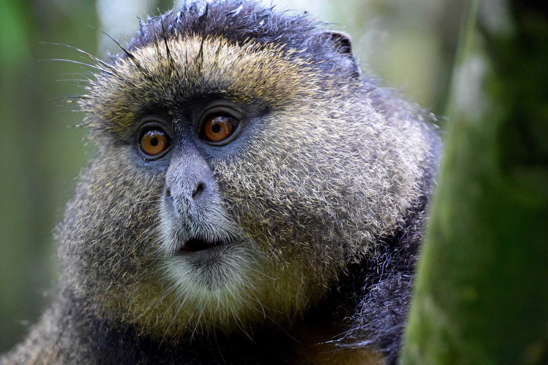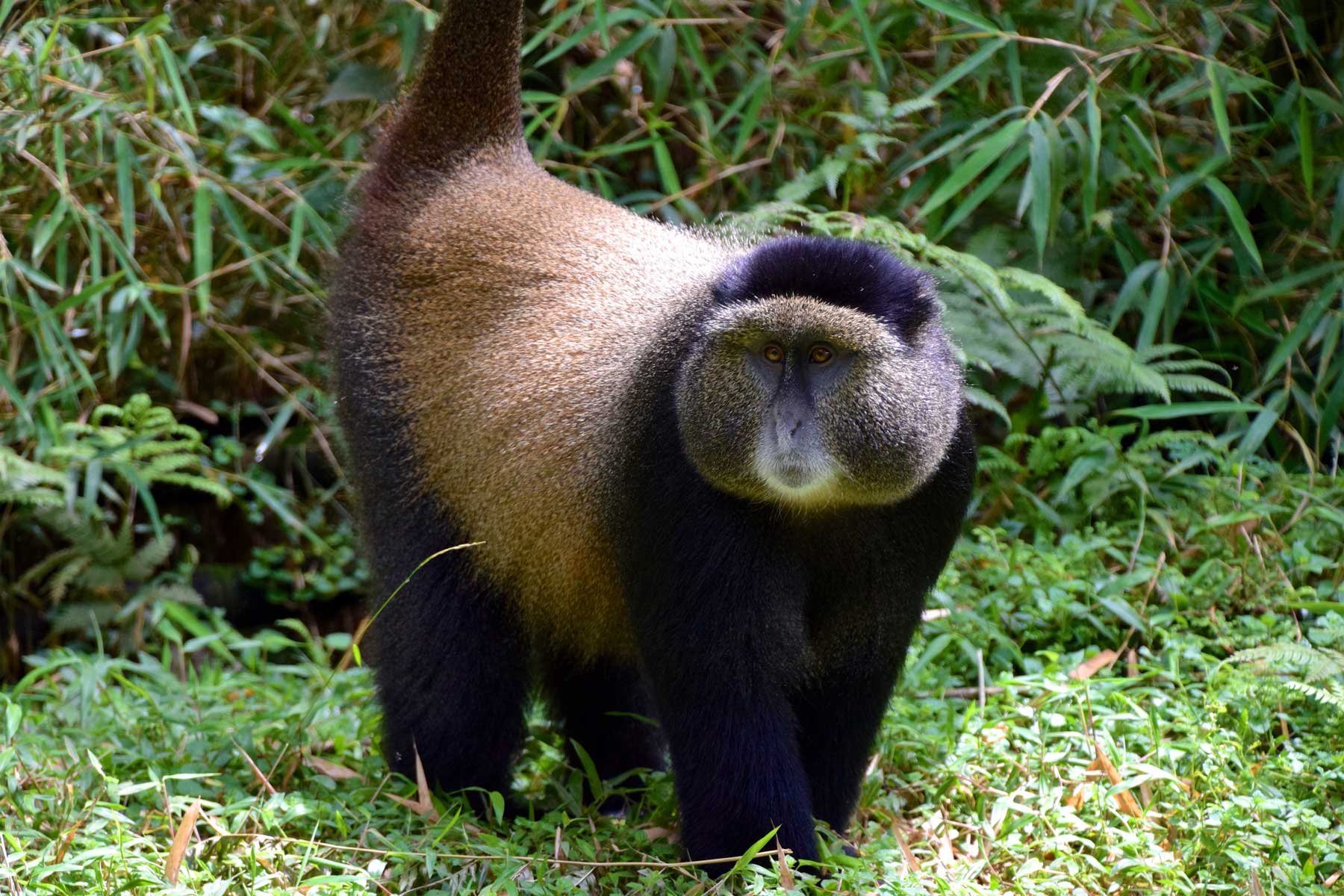 Die Goldmeerkatze (golden monkey) ist eine Unterart der in Afrika weit verbreiteten Diademmeerkatze. Goldmeerkatzen bewohnen ausschließlich einige kleine Gebiete im Bereich der Virunga-Vulkane.