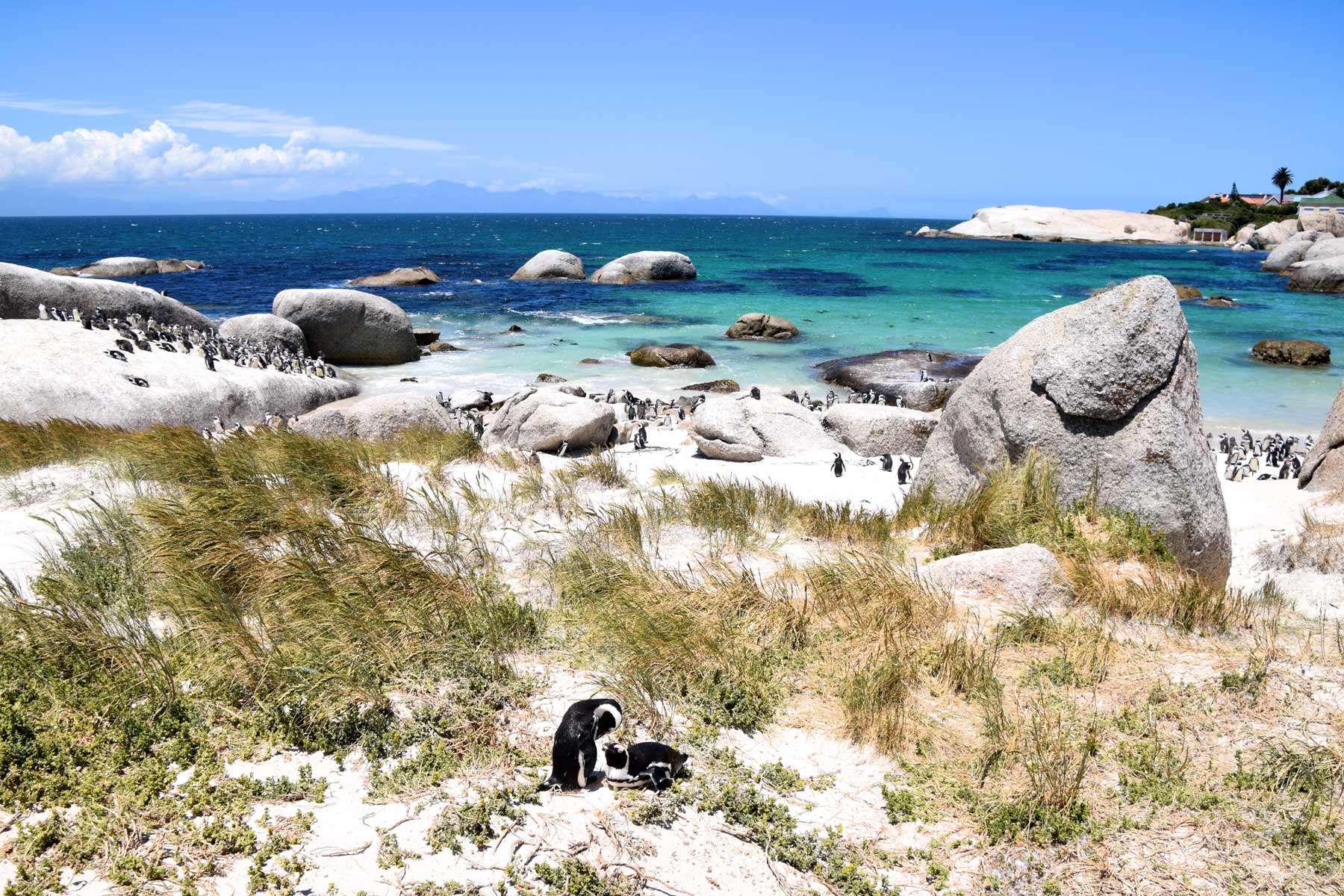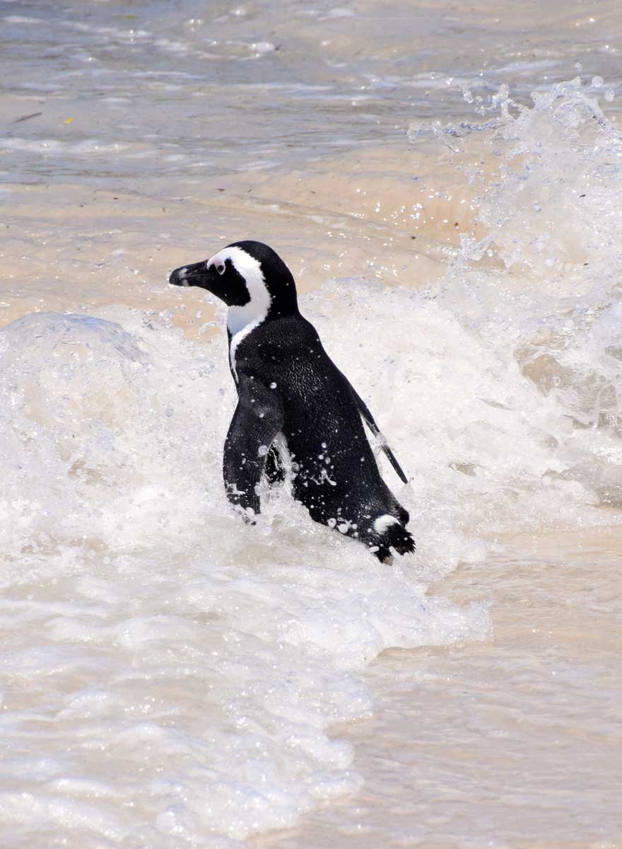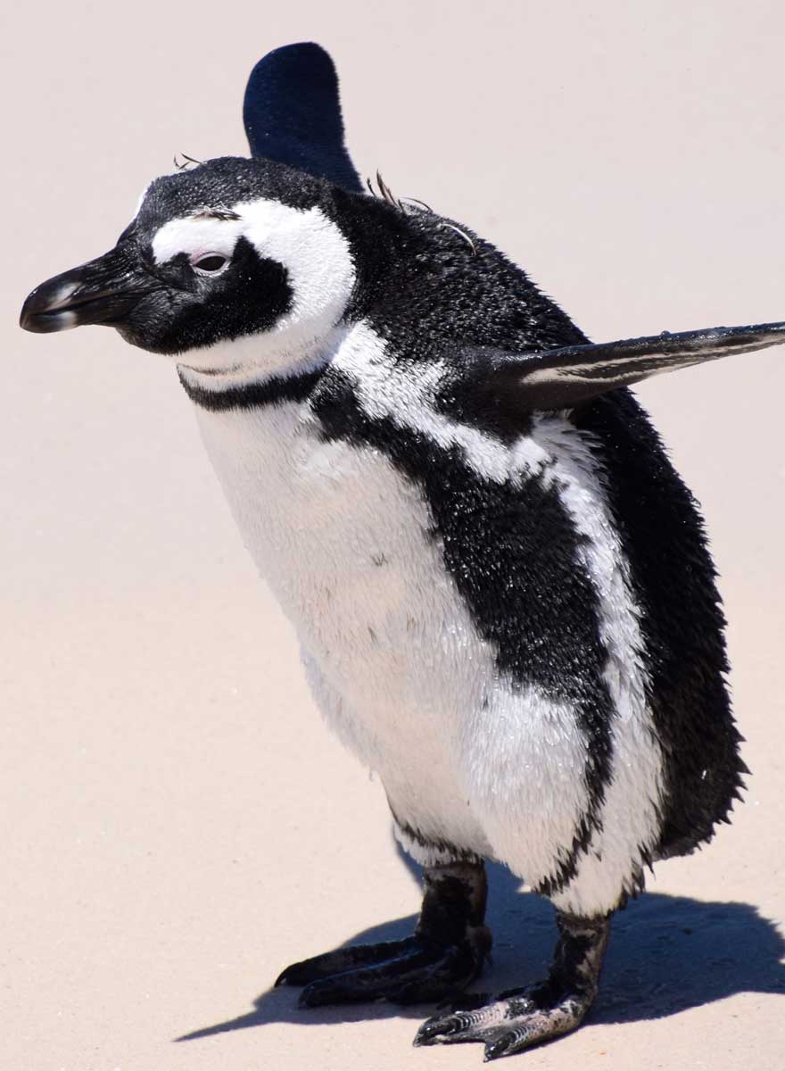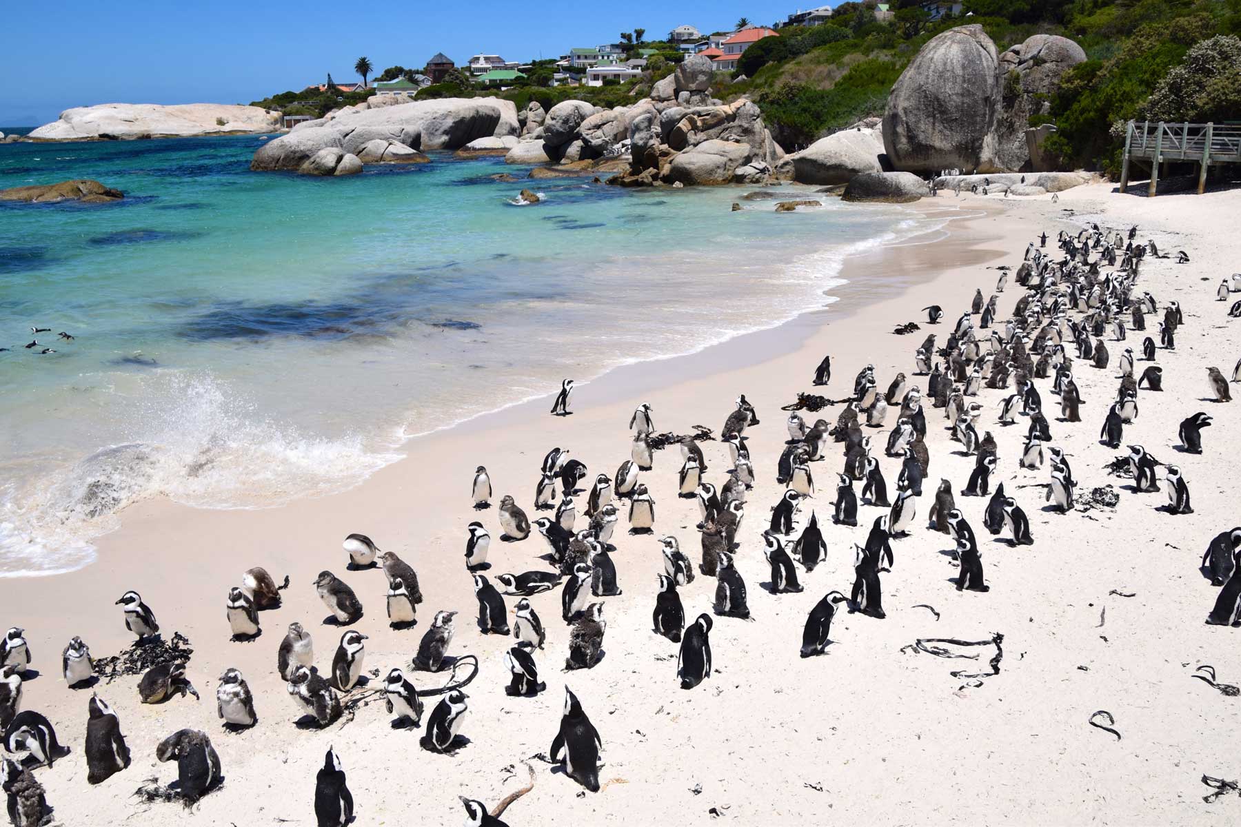 Die (African) Penguin Colony. 1983 fand man hier unter den windgeschützten Büschen ein einsames Pinguin-Pärchen. Mittlerweile haben diese sich vermehrt und andere Familien angezogen, sodass sich jetzt über 2.000-3.000 Brillenpinguine an dem kleinen Strandabschnitt tummeln. Der Brillenpinguin (Spheniscus demersus) steht jedoch auf der Liste der bedrohten Tiere (1900: 4 Mio. Tiere, heute: ca. 70.000). Im südlichen Afrika gibt es auf dem Festland neben Boulders Beach nur noch Brutstätten bei Betty’s Bay und in Namibia. Weitere Pinguine leben auf 24 Inseln zwischen Namibia und Algoa Bay, z.B. Dassen Island.