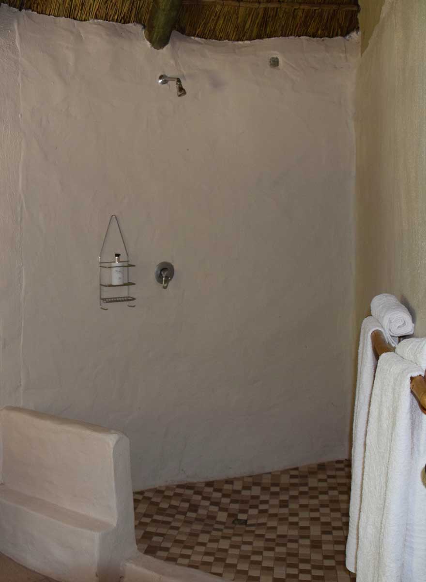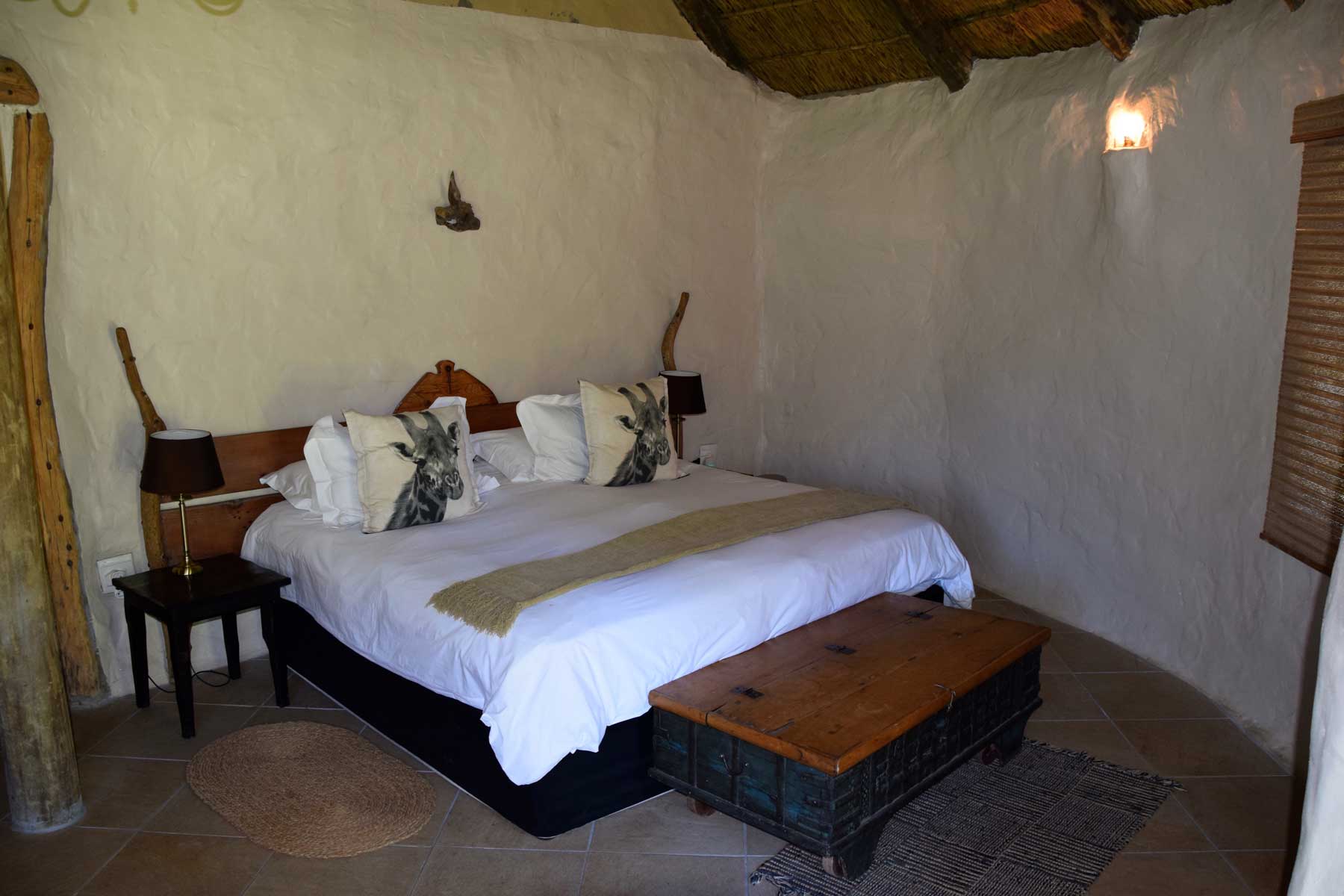 oben: Rondavel; links: Wohnbereich; rechts: Dusche; unten: Schlafbereich