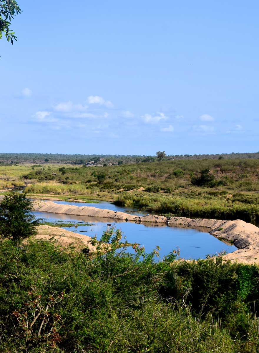 Nach dem Frühstück, mit Blick auf den Fluss und den Krüger Park, fahren wir nochmals in den Park und über eine "grauenhafte" Sandstrasse (S25) vom Crocodile Bridge Gate zum Malelane Gate und sehen dabei Impalas, Giraffen und Zebras.