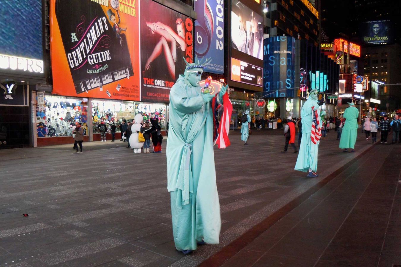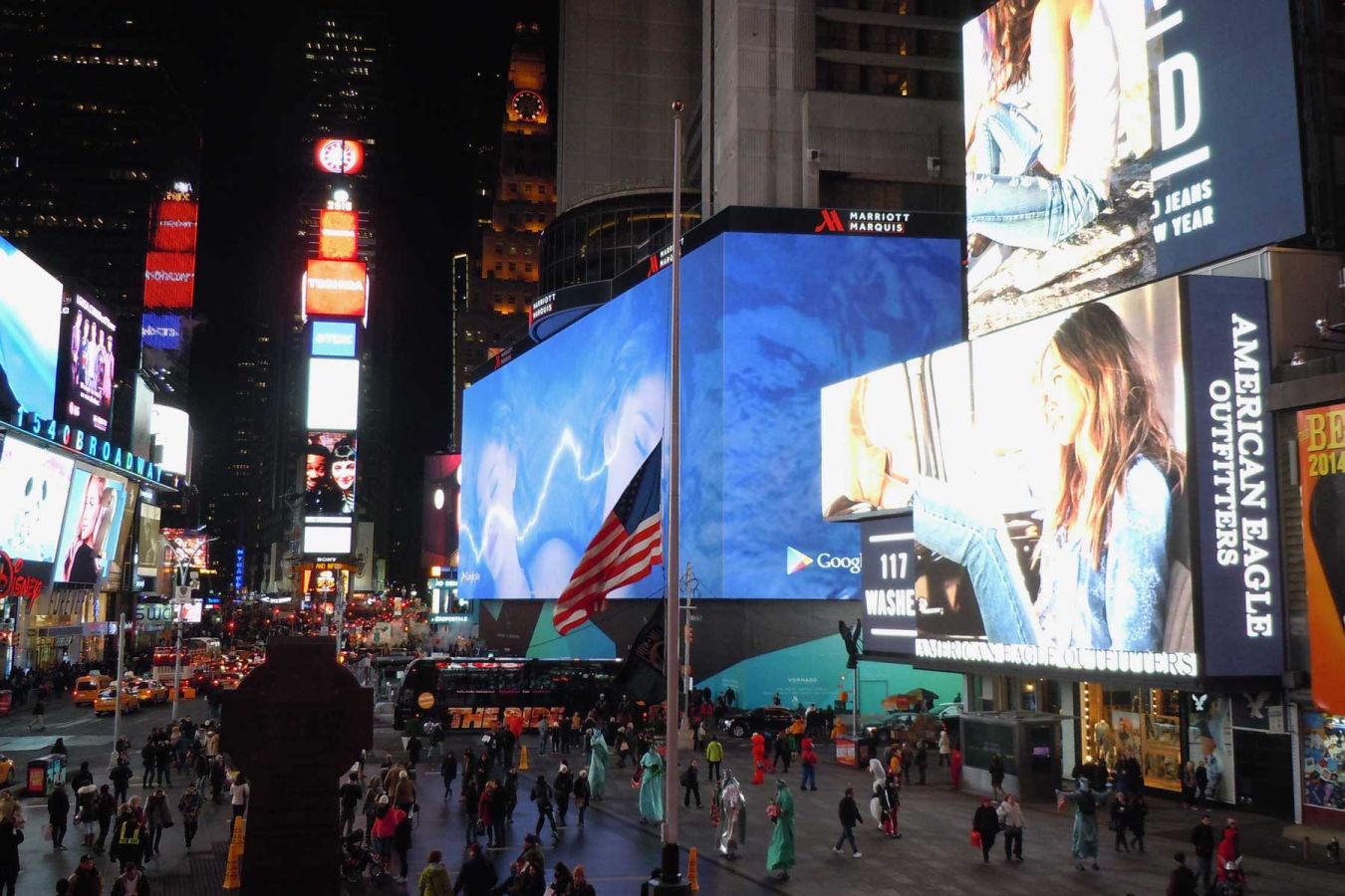 Nach einer kurzen Ruhephase im Zimmer im 15. Stock gehen wir ein wenig bummeln und sehen uns den hell erleuchteten Times Square an. Wir gehen die 47th Street entlang zur 5th Avenue und dort hinauf bis zum Rockefeller Center. Wir umrunden den Eislaufplatz und gehen die 50th Street zurück zum Times Square.