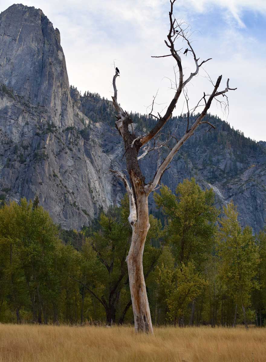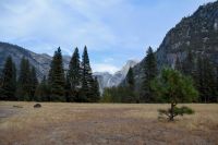 Wir sehen die Highlights El Capitan und Half Dome, aber leider bei bewölktem Himmel. Und... die Wasserfälle, z.B. die Yosemite Falls, sind um diese Jahreszeit ausgetrocknet....