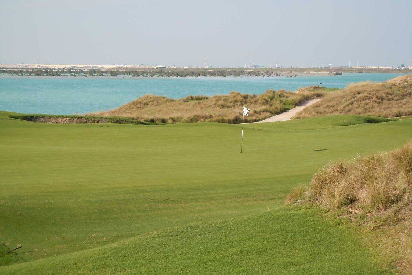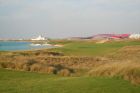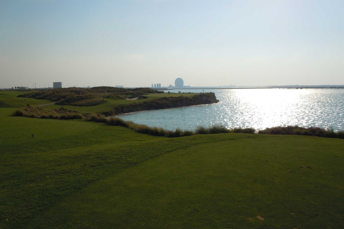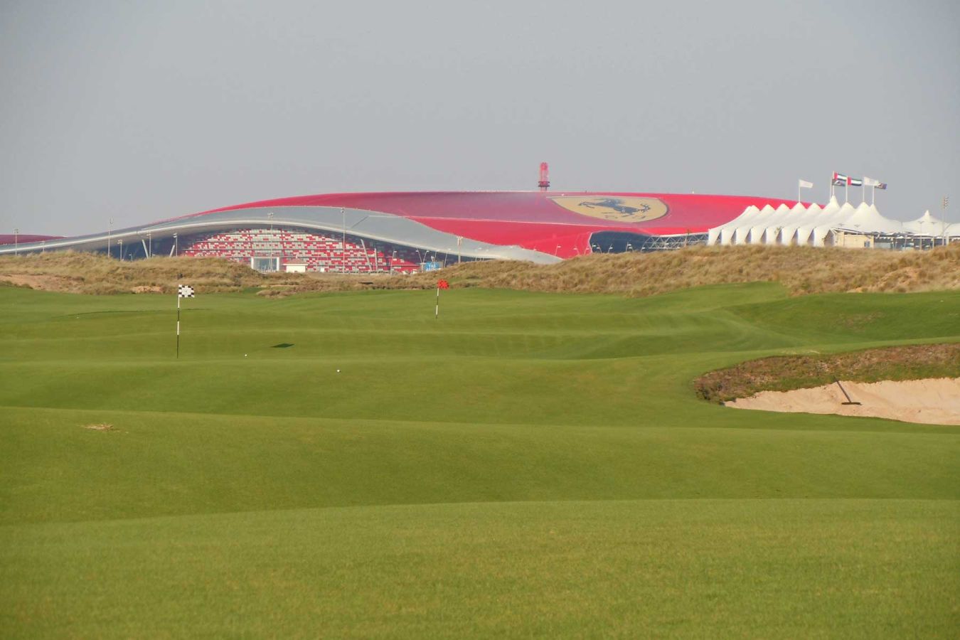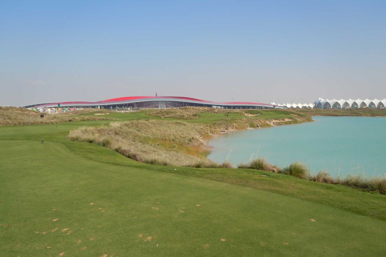Gegen 10.00 Uhr fahren wir mit dem Auto Richtung Abu Dhabi und dort nach Yas Island. Der Golfplatz Yas Links Golf Course befindet sich direkt neben der neuen Formel 1 Rennstrecke und der neuerbauten Ferrari World.