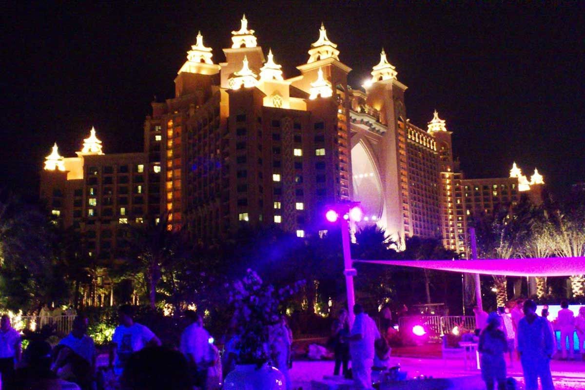 Nach einem Abendessen im Clubhaus fahren wir auf dem Rückweg auf die Palm Jumeirah, denn direkt neben dem Hotel Atlantis befindet sich der Nasimi Beach. An diesem findet einmal im Monat an einem Freitag eine Beach-Party statt.
