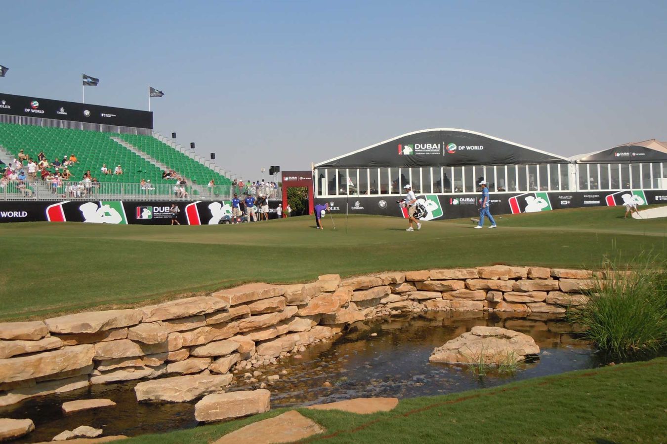 Auf der Tribüne hinter dem 18. Loch hat man einen sehr guten Blick auf die herankommenden Spieler auf auf die sensationellen Schläge aufs Grün bei diesem abschließenden Par 5. Und zwei große Sieger…