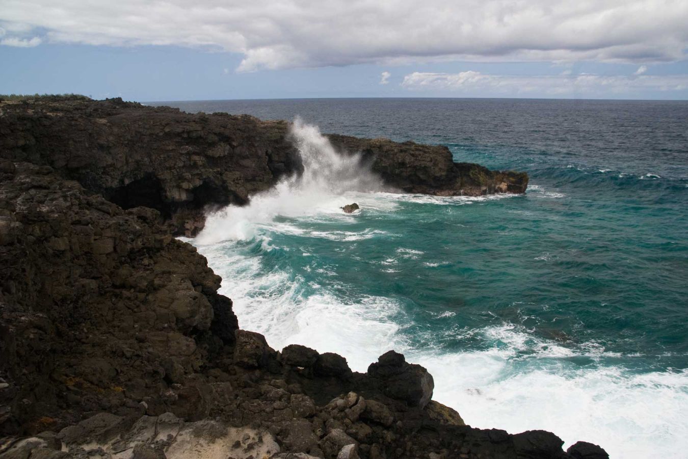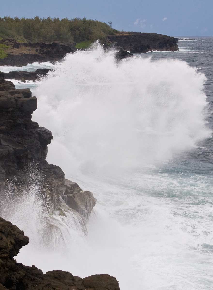 Nach dem Frühstück in der Villa fahren wir Richtung L'Escalier an der Südküste und von dort an einer Zuckerfabrik vorbei und ca. 2 km durch Zuckerrohrfelder und über eine holprige Straße zu Le Souffleur. An der schwarzen Lava-Steilküste brechen sich die Wellen, die von Süden heranbrausen. An diesem Teil der Küste befindet sich kein vorgelagertes Riff. Und wir sind ganz allein.