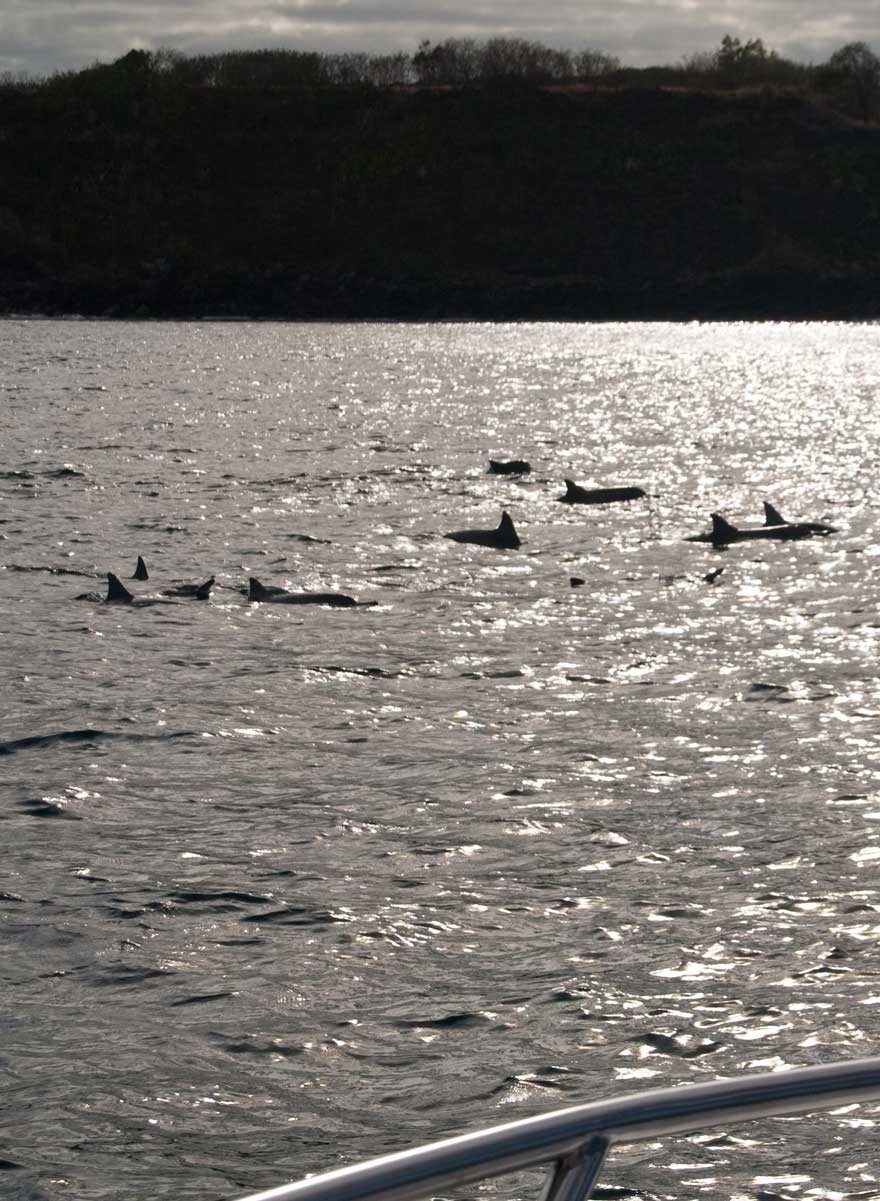 Wir springen ins Wasser, obwohl es im Freien noch recht kühl ist, und Schnorcheln ein wenig herum. Einmal schwimmen die Delphine relativ knapp an uns vorbei. Und, man hört laufend ihr Gezwitscher….