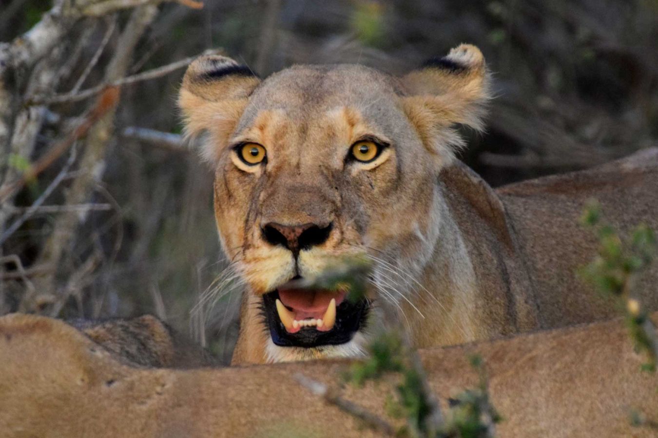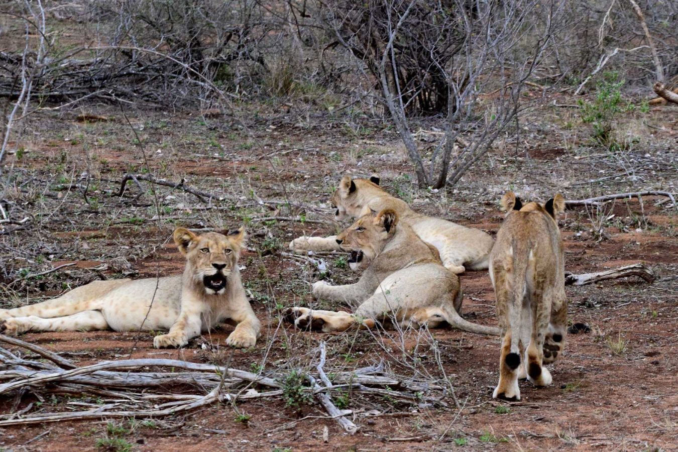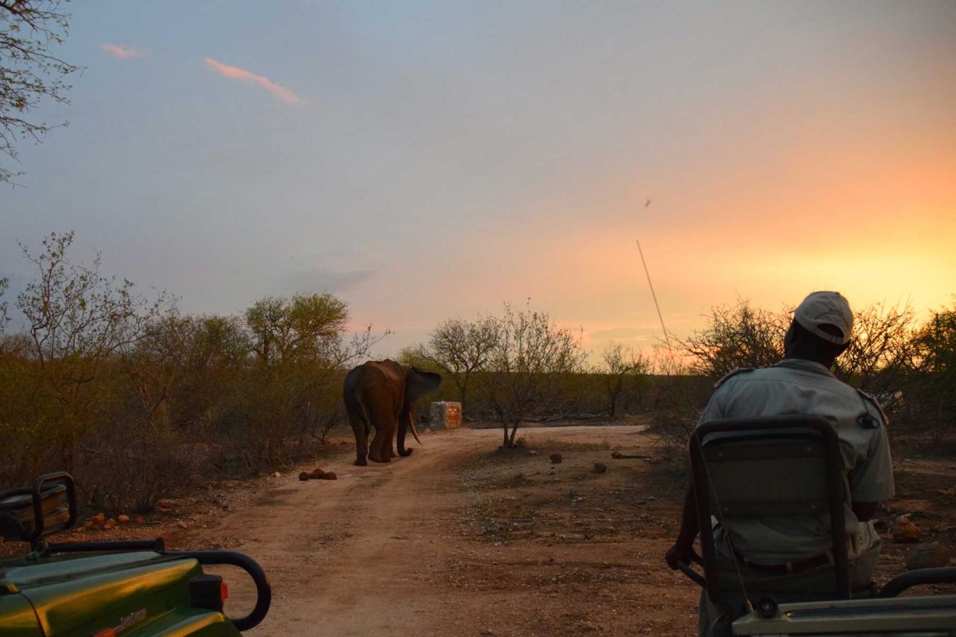 Die Safari erfolgt im offenen Geländewagen. Unser Fahrer ist „Prim“ und unser Fährtenleser (Tracker) ist „Opa“, der Bruder von „Prim“. Wir sitzen zu fünft im Jeep. Bis zum Sonnenuntergang sehen wir Impalas, Kudus, Elefanten die hautnah an den Jeep herankommen, eine Löwin mit 6 jungen Löwen, einige Löwen die ein Zebra vertilgen und vieles mehr.