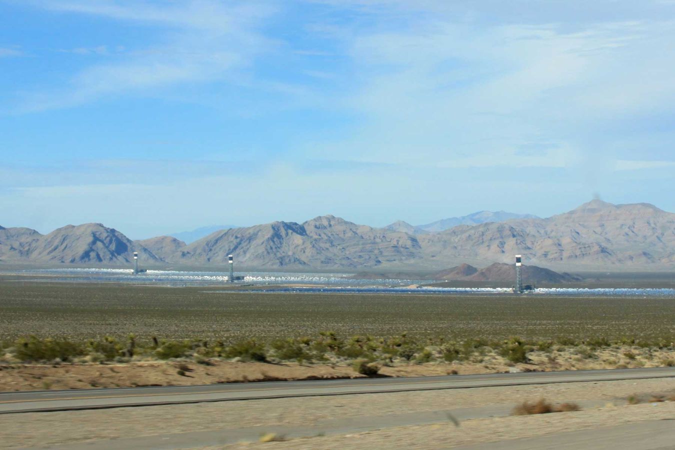 Außerhalb des Großraums Los Angeles sieht man die Wüste und die Berge. Kurz vor der Grenze nach Nevada kommen wir am relativ neu errichteten Sonnenkraftwerk Ivanpah Solar Electric Generating System vorbei, einer der größten Solaranlagen der Welt. Tausende Sonnenkollektoren mitten in der Wüste…