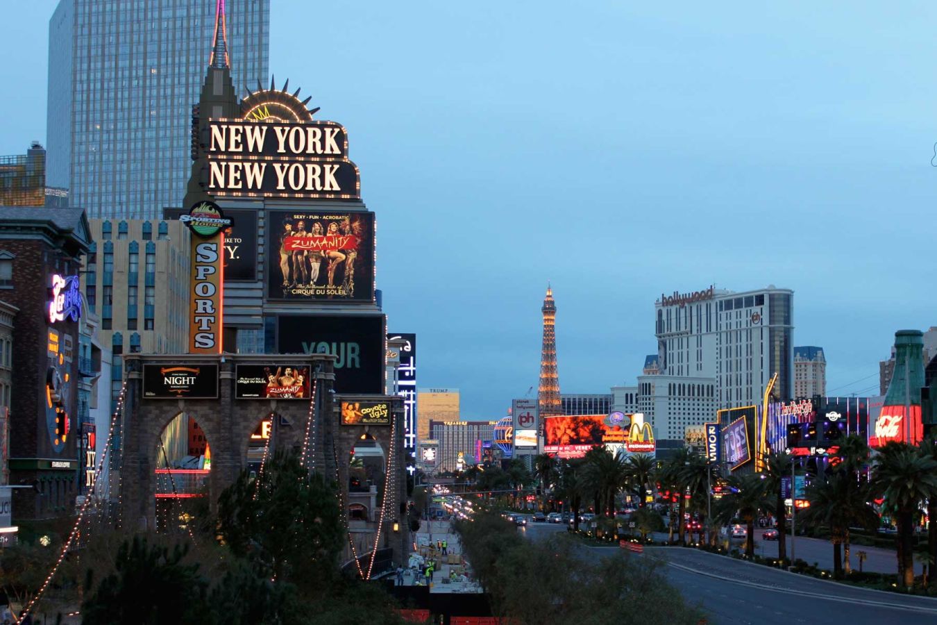 Nach einer kurzen Pause im Hotel, es dämmert schon, spazieren wir über den Las Vegas Strip: vom Tropicana über Fußgängerbrücken ins New York New York, vorbei am Monte Carlo ins neu errichtete Aria. Von dort geht's zum Abendessen zu Bubba Gump bei der Miracle Mall.