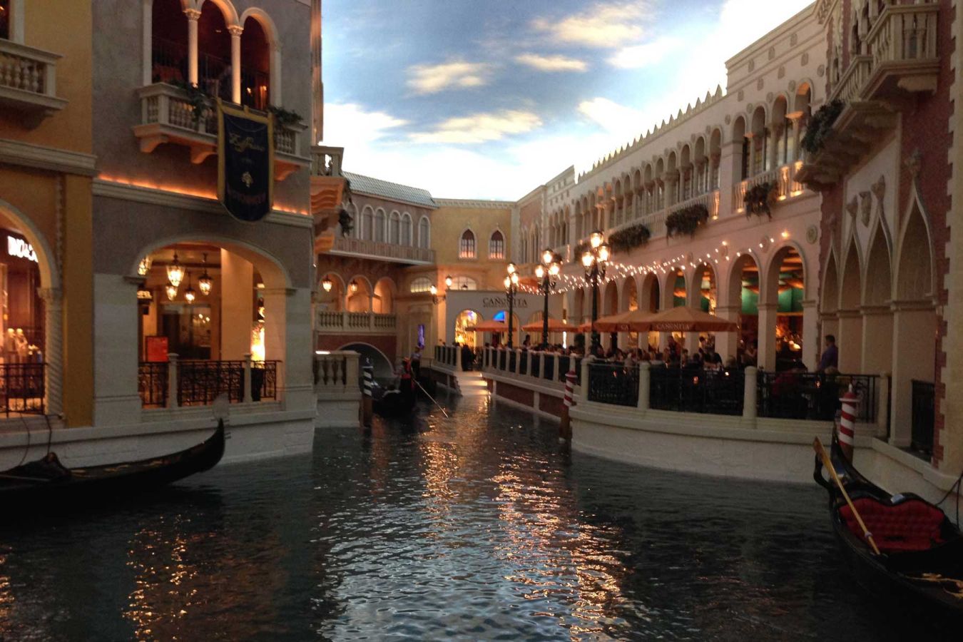 Wir überqueren den Las Vegas Blvd. und gehen ins Venetian. Man fühlt sich in das Original versetzt, mit Campanile, Rialto Brücke und Gondoliere in der Shopping-Mall…