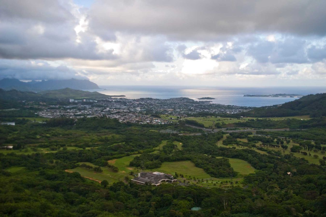 Zurück geht's über den Pali Highway. Der Highway windet sich in Serpentinen den steilen Abhang hinauf und bietet dabei einen tollen Blick auf die Ebene und Bucht von Kane‘ohe.