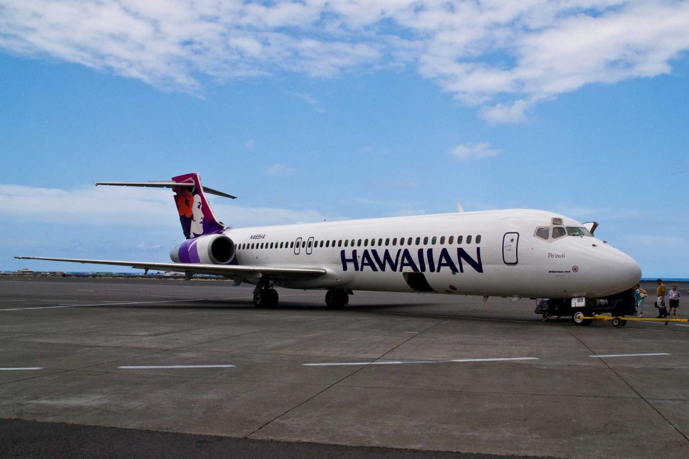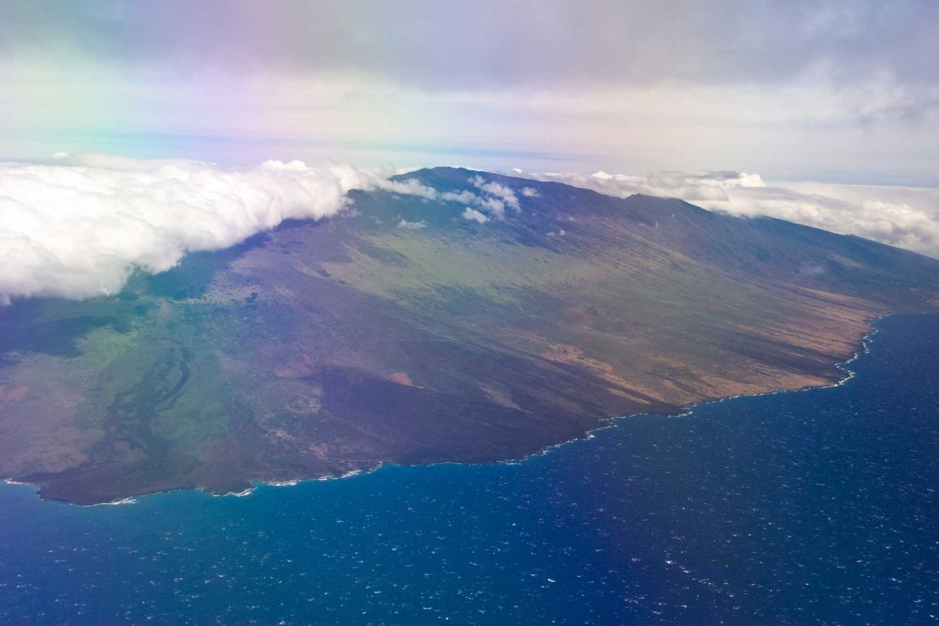 Um 11.00 Uhr folgt ein 29-min-Flug mit Hawaiian Airlines von Kailua-Kona nach Maui mit herrlichen Ausblicken auf die Insel beim Anflug. Man sieht, wie sich die Wolken am Haleakala Crater stauen.