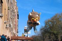 Wir haben an der Kreuzung West 62nd Street und Central Park West einen perfekten Standplatz gefunden, um die Parade zu beobachten. Riesige Luftballons mit bekannten Figuren – Kermit, Charlie Brown, McDonalds, Jimmy Neutron, Pokemon, etc. – und Musikapellen, Cheerleaders und verschiedenen Themenwagen kommen an uns vorbei.