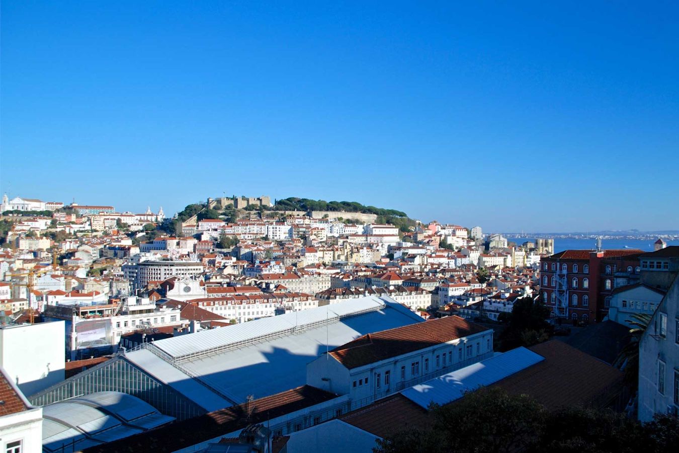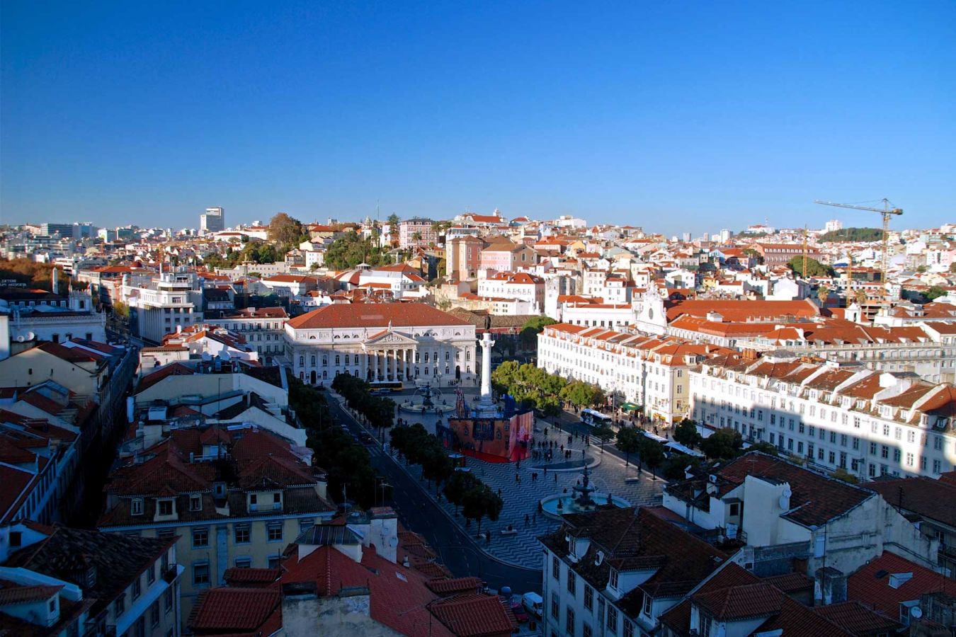 Wir fahren an den Docks mit vielen Lokalen vorbei (Docas de Santo Amaro - Vergnügungsviertel am Fluss) und über die Avenida Infante Santo bis zum Praca Marquis de Pombal. Dort liegt unser Hotel. Nach dem Einchecken gehen wir zu Fuss über die Avenida da Libertade Richtung Stadtzentrum. An der Praca dos Restauradores fahren wir mit dem Elevador de Gloria zum Miradouro de Sao Pedro de Alcantara, mit herrlichem Blick über die Stadt.