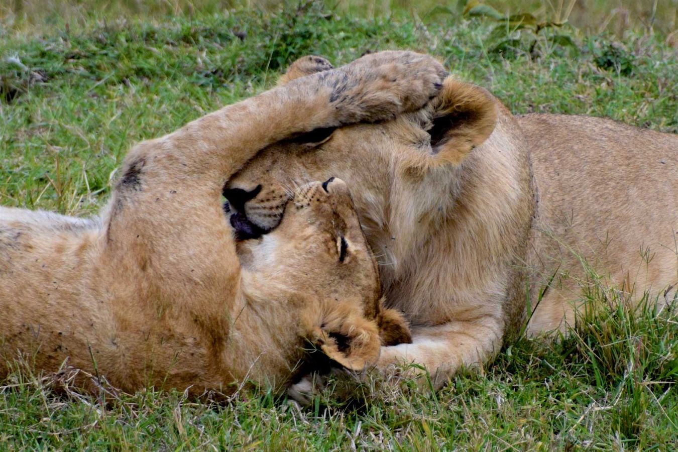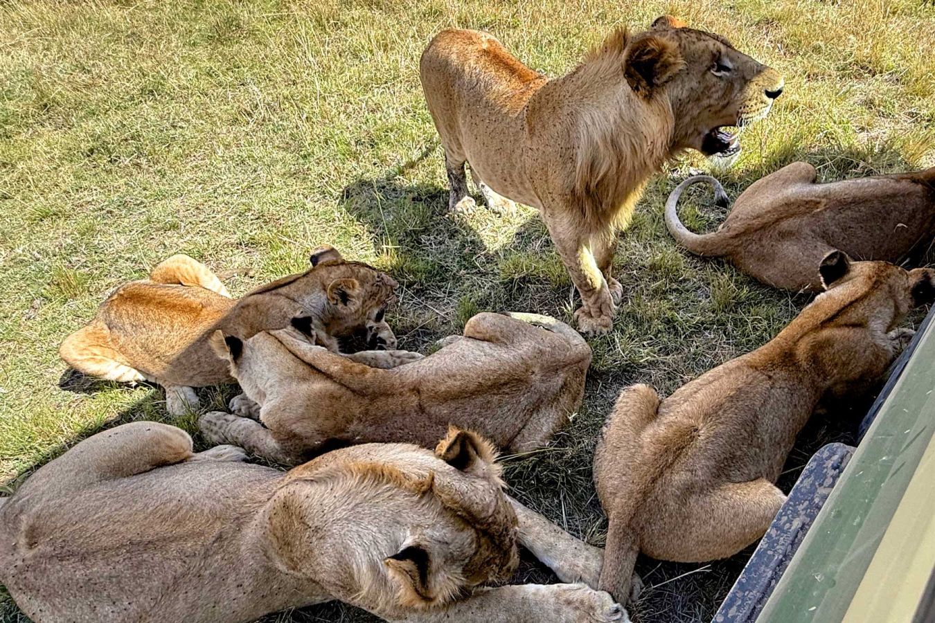 Nach dem Mittagessen beim Kogatende Airstrip fahren wir wieder über die einzige Brücke des Mara River und sehen schon bald eine Löwen-Familie von 8 Löwen. Sie spielen und schlafen und nach einiger Zeit liegen plötzlich 6 Löwen im Schatten unseres Autos... zum Angreifen nahe... toll.