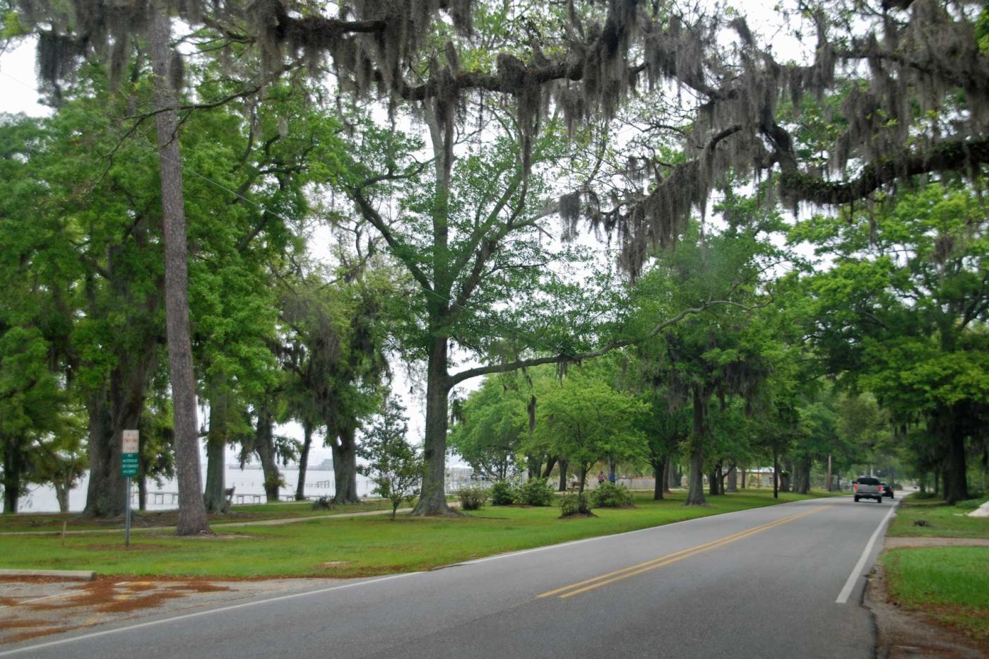 Über die Highways R59 und R98 fahren wir in Richtung Point Clear. Ein wenig weg vom Strand sind wir gleich wieder in einer ebenen Landschaft. Teilweise sind die Bäume so grün, manche Sorten sind noch kahl. Ab Barnwell folgen wir der CR98, die der Küste entlangführt, vorbei an hübschen Häusern direkt an der Mobile Bay.