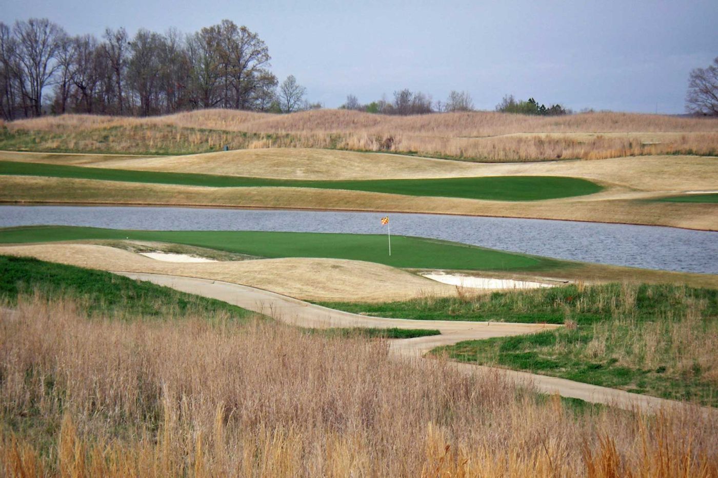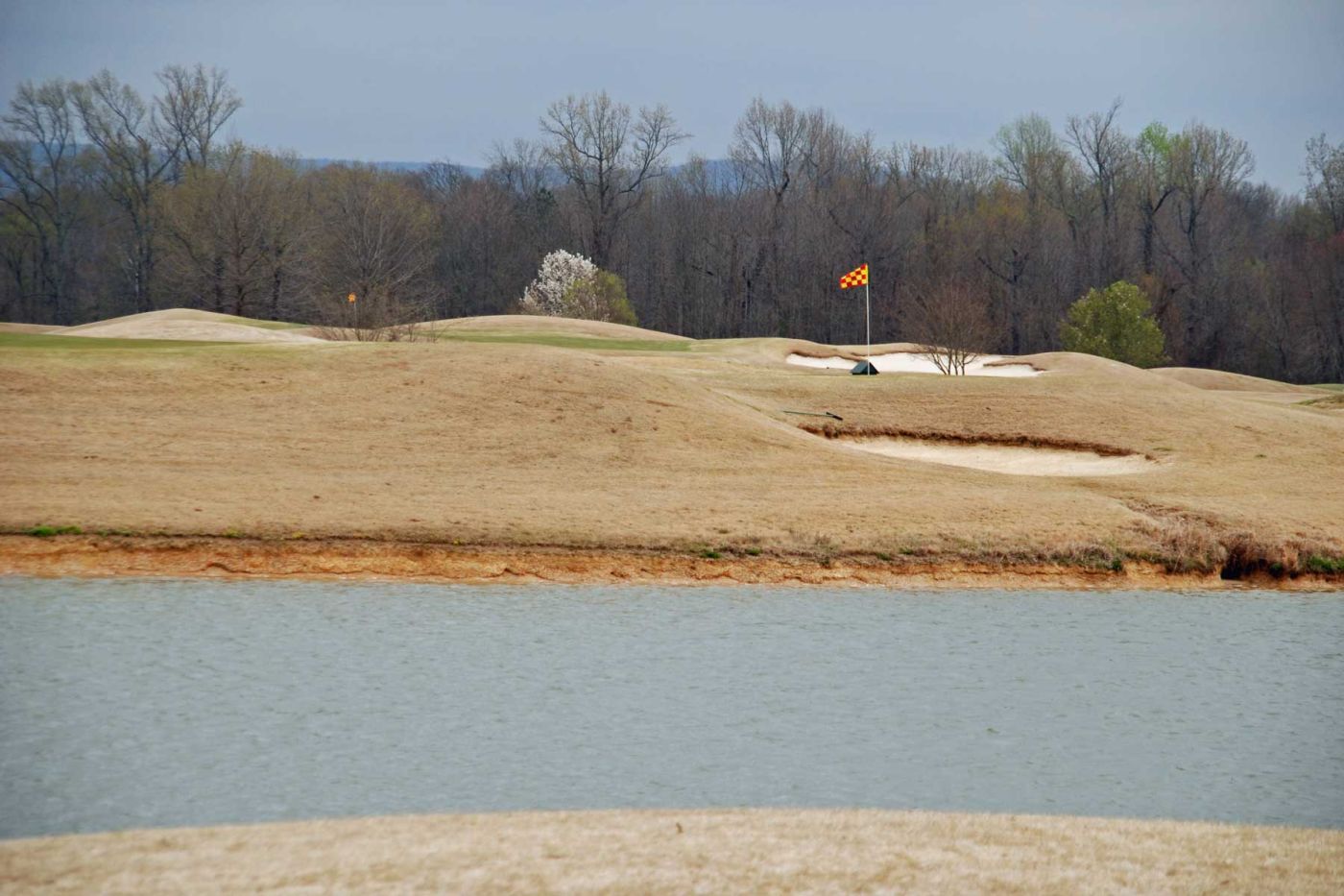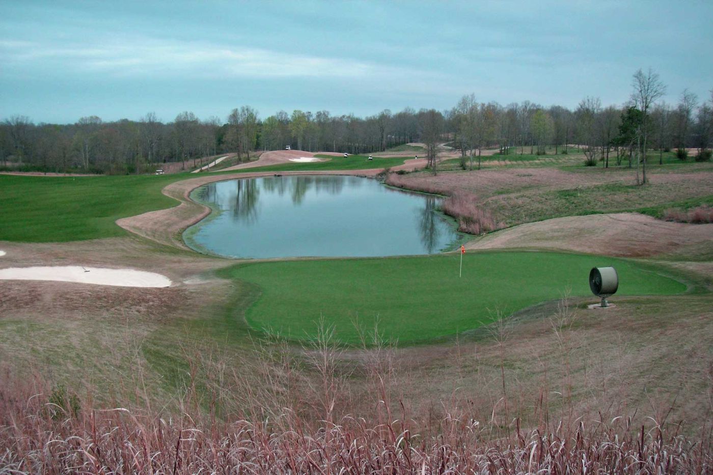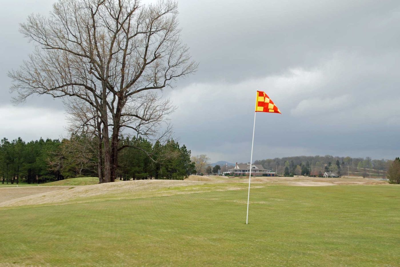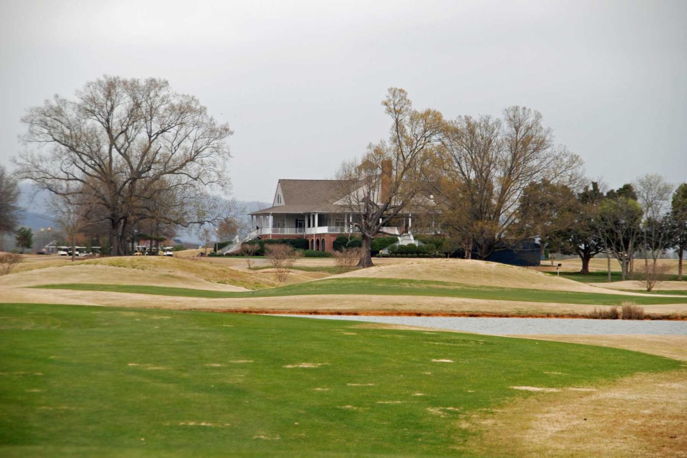 Anschließend fahren wir weiter zum The Shoals Golf Club. Wir spielen den Kurs “The Fighting Joe”. Es ist ein Platz mit viel Wasser und vielen Bunkern. Aber es herrscht dunstiges kühles Wetter und ab dem 8. Loch hören wir Donnergrollen und am 9. Loch erfolgt der Abbruch wegen Gewittergefahr (severe weather) und die Sirenen tönen.