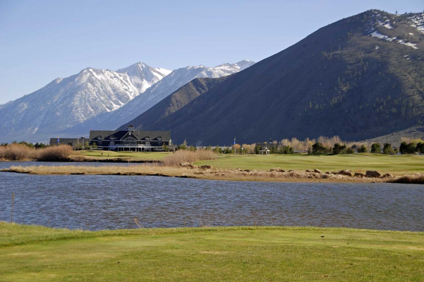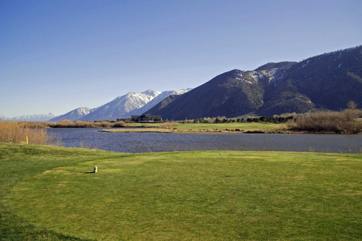 Wir spielen den „Lakes Course“. Die Gegensätze zwischen den grünen Fairways, den kahlen und gelben Cottonwood-Trees, der Ebene und den Bergen, einfach toll. Die High Sierra Nevada, Kühe grasen, ein Deer läuft über den Platz, Gänse...