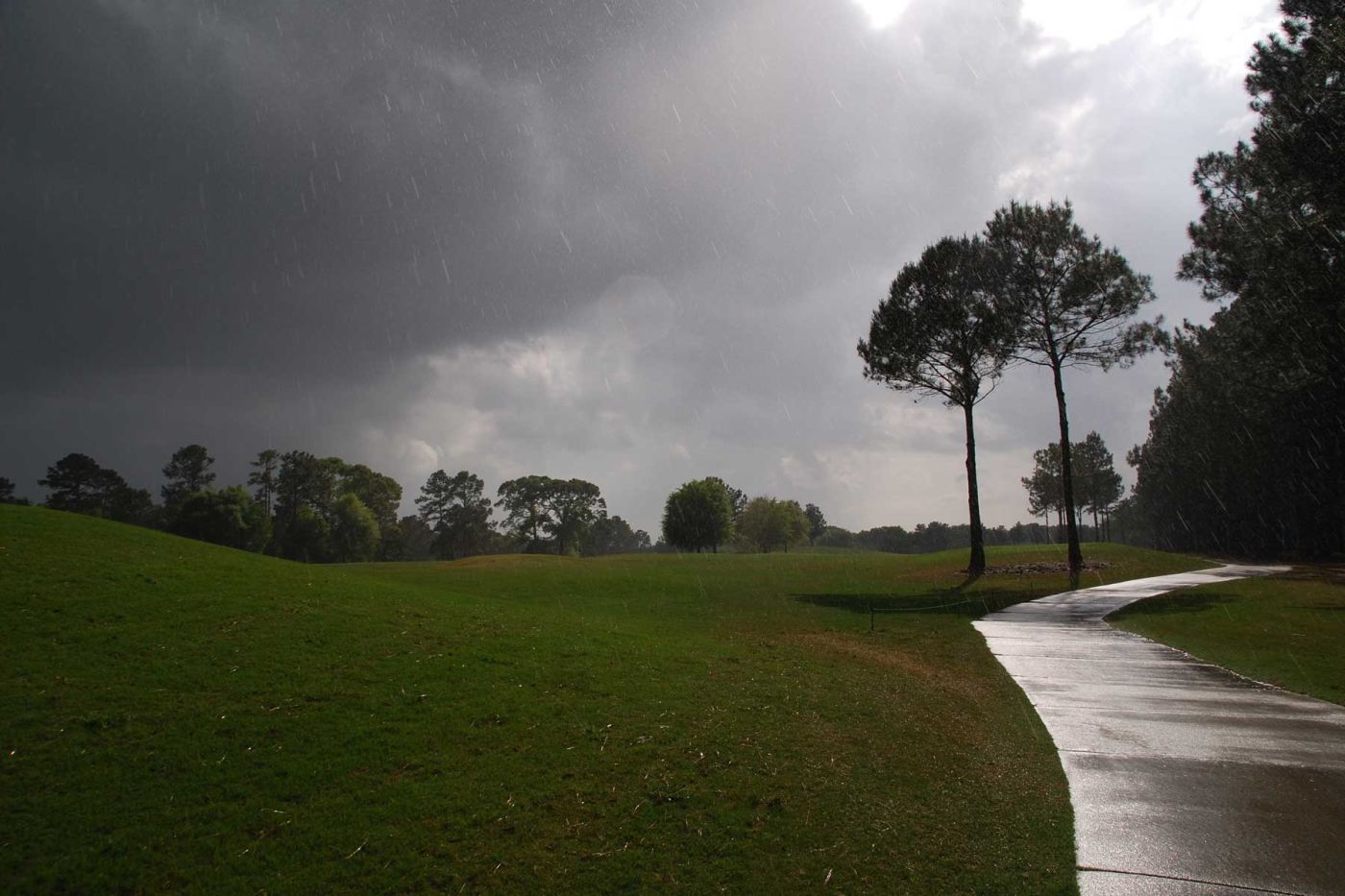 Die ersten 9 Loch nennen sich „Highlands“, die zweiten 9 Loch „Magnolia“. Diese spielen wir nach dem Regen. Im Shop kaufen wir noch Regenhüllen für das Bag. Der Platz ist triefnass und es ist dunkel, als wir das Clubhouse erreichen. Wir sind wieder die letzten Gäste…