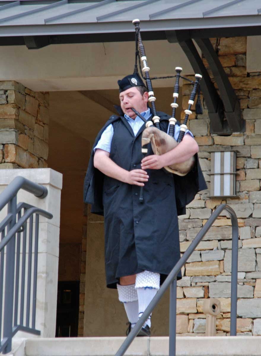 Wir fahren daher weiter zum Golfplatz Ross Bridge Golf Resort & Spa. Rossbridge ist der bisher schönste und eindrucksvollste Platz. Er ist sehr weitläufig angelegt. Ab und zu scheint die Sonne, ab und zu nieselt es. Als wir zum Clubhouse zurückgehen, empfängt uns ein Dudelsackspieler, eine tägliche Zeremonie in Rossbridge…
