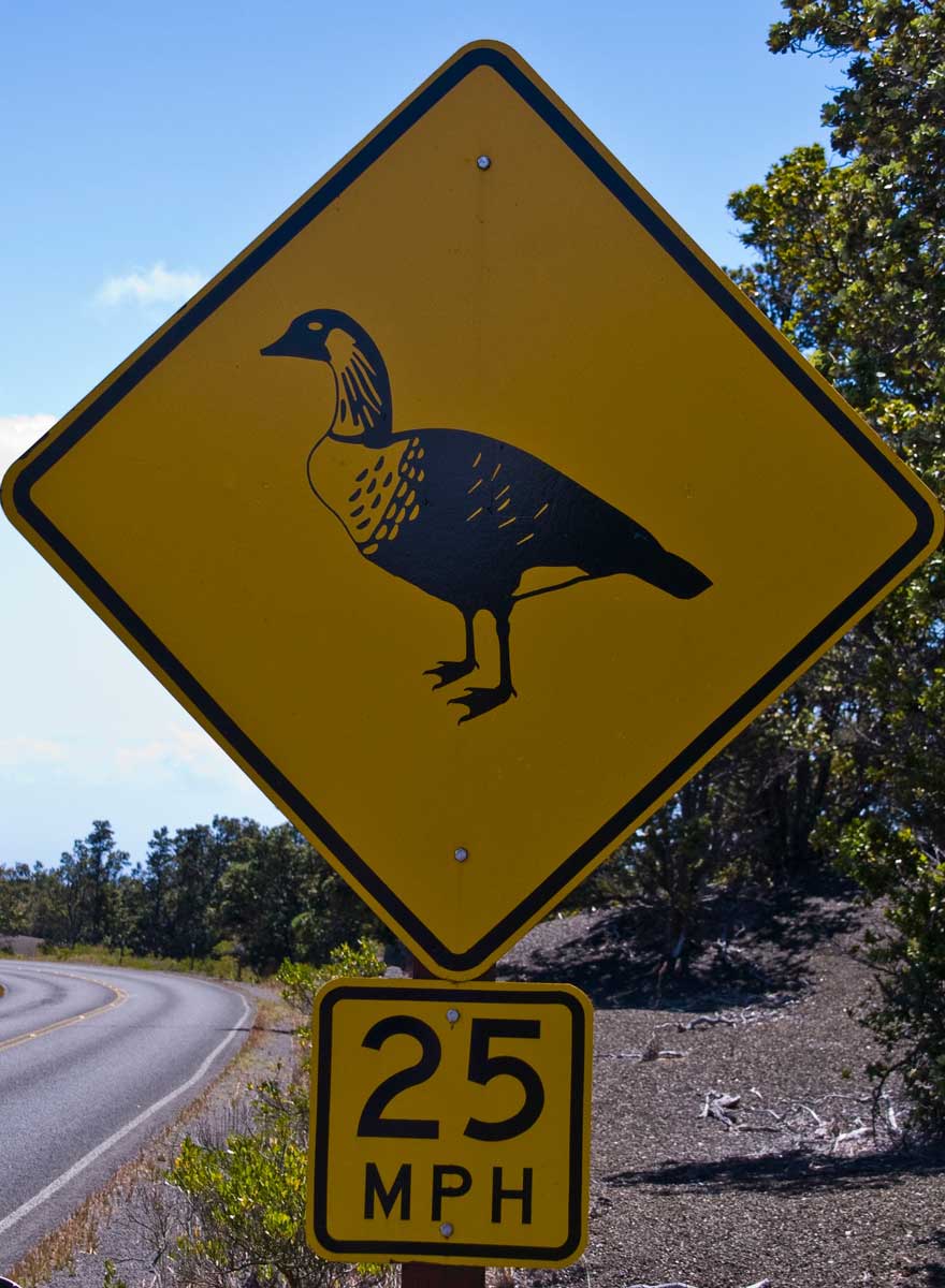 Vorbei an den Steam Vents und der Lava Tube geht es die Chain of Craters Road 19 Meilen bergab bis ans Meer. Unterwegs sehe ich laufend Achtung-Schilder wegen „Nene“, dem Nationaltier.