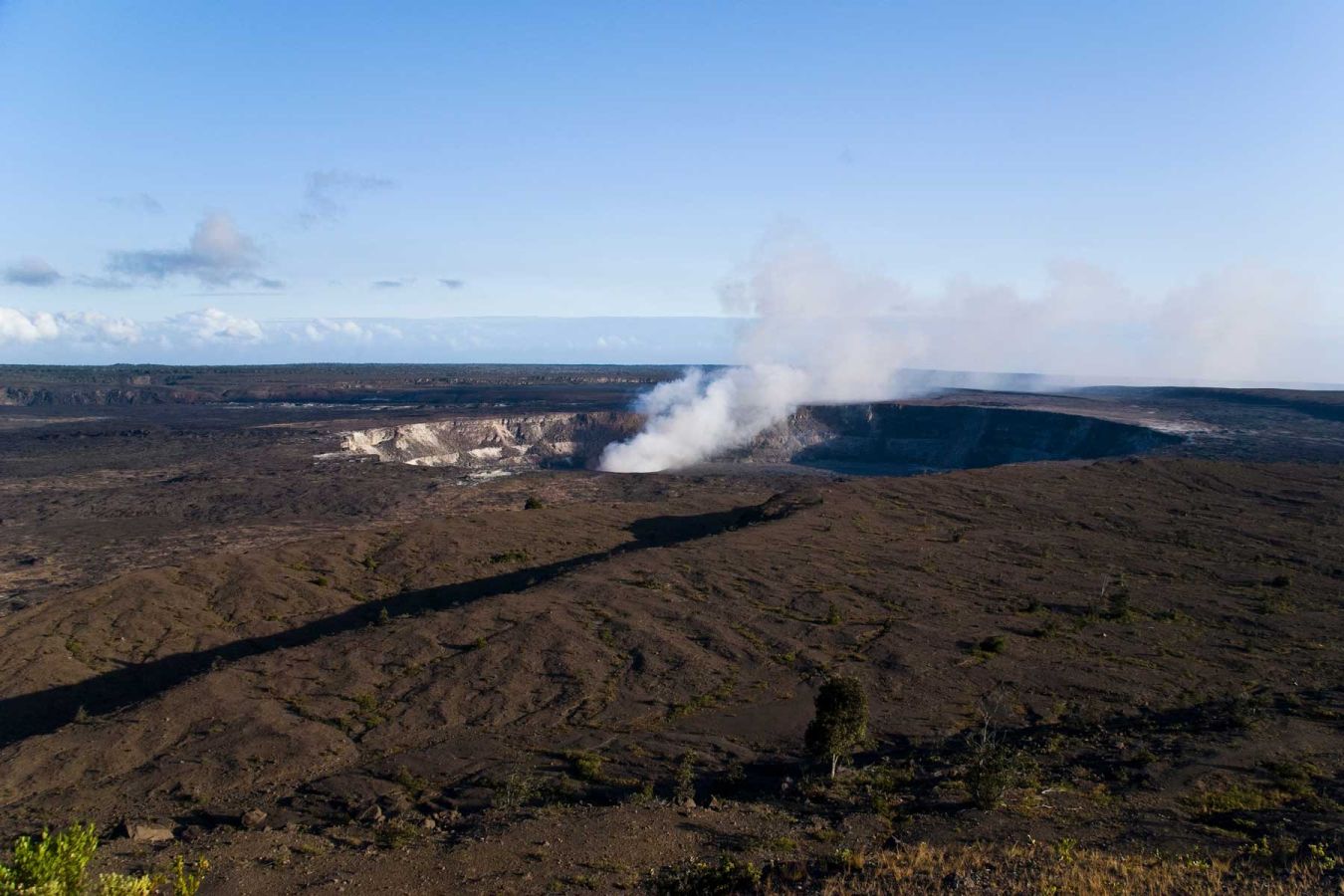 Anschließend habe ich nur mehr 3 Meilen bis zum Volcanoes National Park. Der Nationalpark liegt auf 4.024 ft Höhe (ca. 1.200 m). Der südliche Teil der Crater Rim Road (11 Meilen) ist an diesem Tag wegen austretender giftiger Dämpfe gesperrt. Der Krater des Kilauea, der einzige aktive Vulkan der Erde, ist ein riesiger Kessel und aus einem weiteren kleinen Krater steigt Rauch auf.