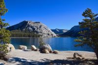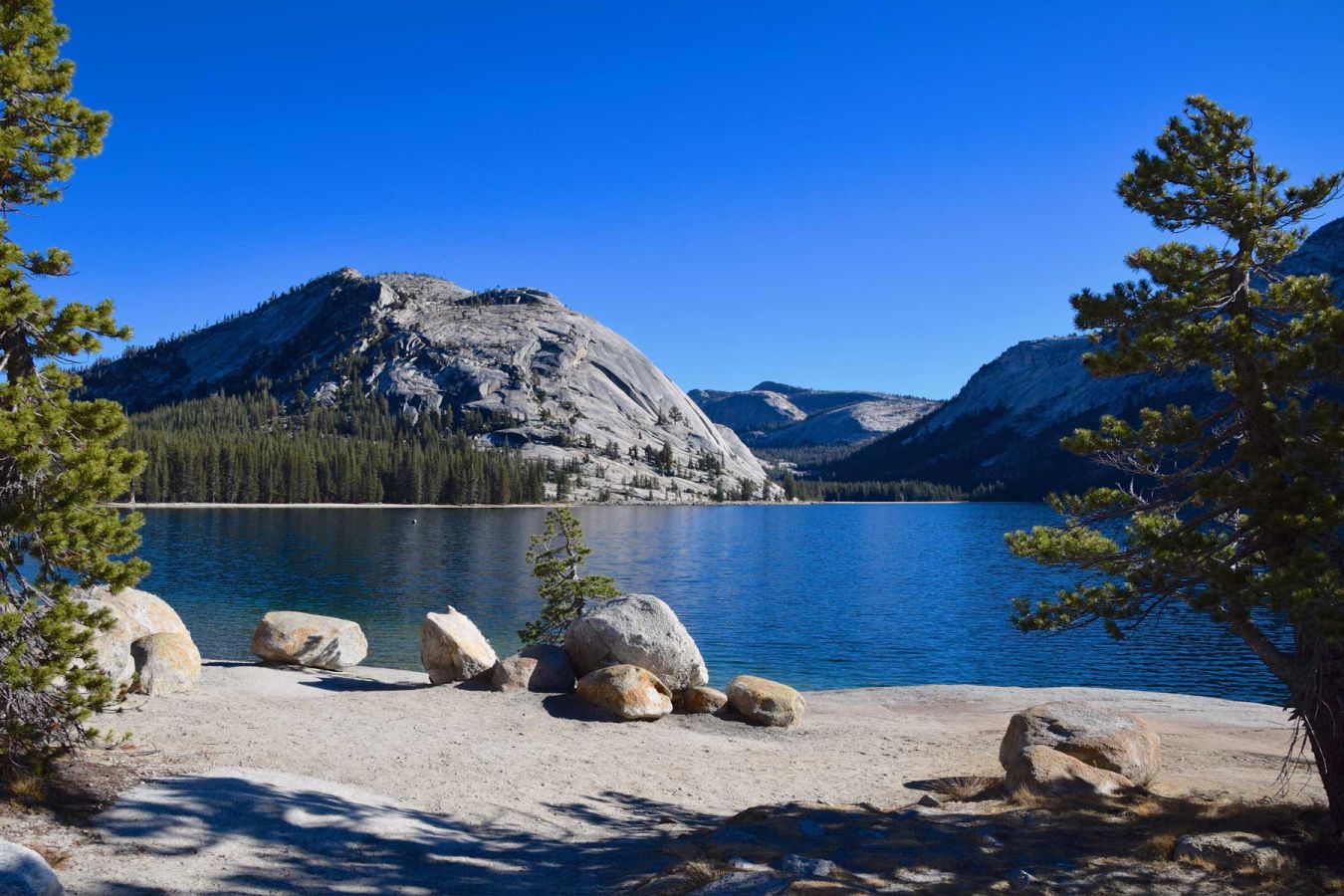 Kurz danach kommen wir zum Tenaya Lake, einem wunderschönen Bergsee. Wolkenloser Himmel und keine Menschen...