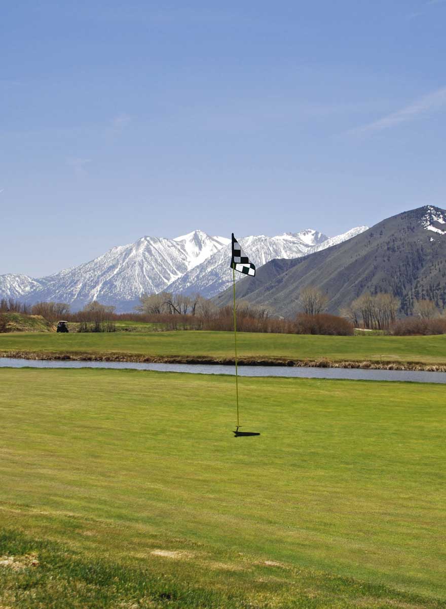 Wir spielen den „Lakes Course“. Die Gegensätze zwischen den grünen Fairways, den kahlen und gelben Cottonwood-Trees, der Ebene und den Bergen, einfach toll. Die High Sierra Nevada, Kühe grasen, ein Deer läuft über den Platz, Gänse...